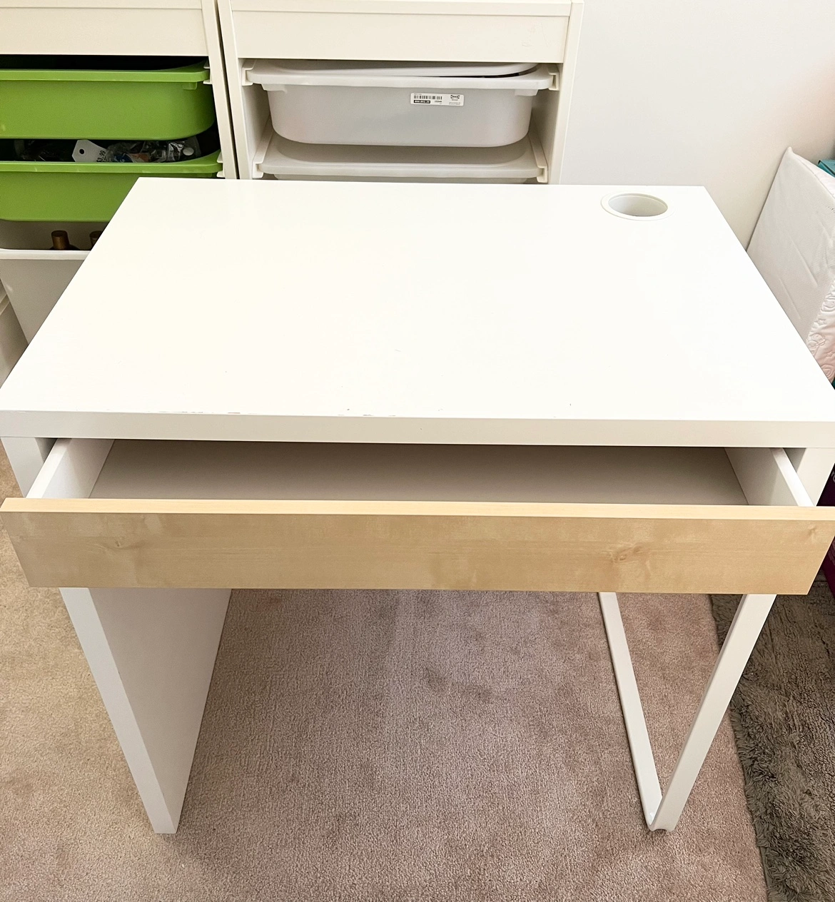 Ikea micke desk in good condition with normal wear as shown in second pic. Some repainting on one of the edges but not showing up in pics. Desk is too small for my monitors.
