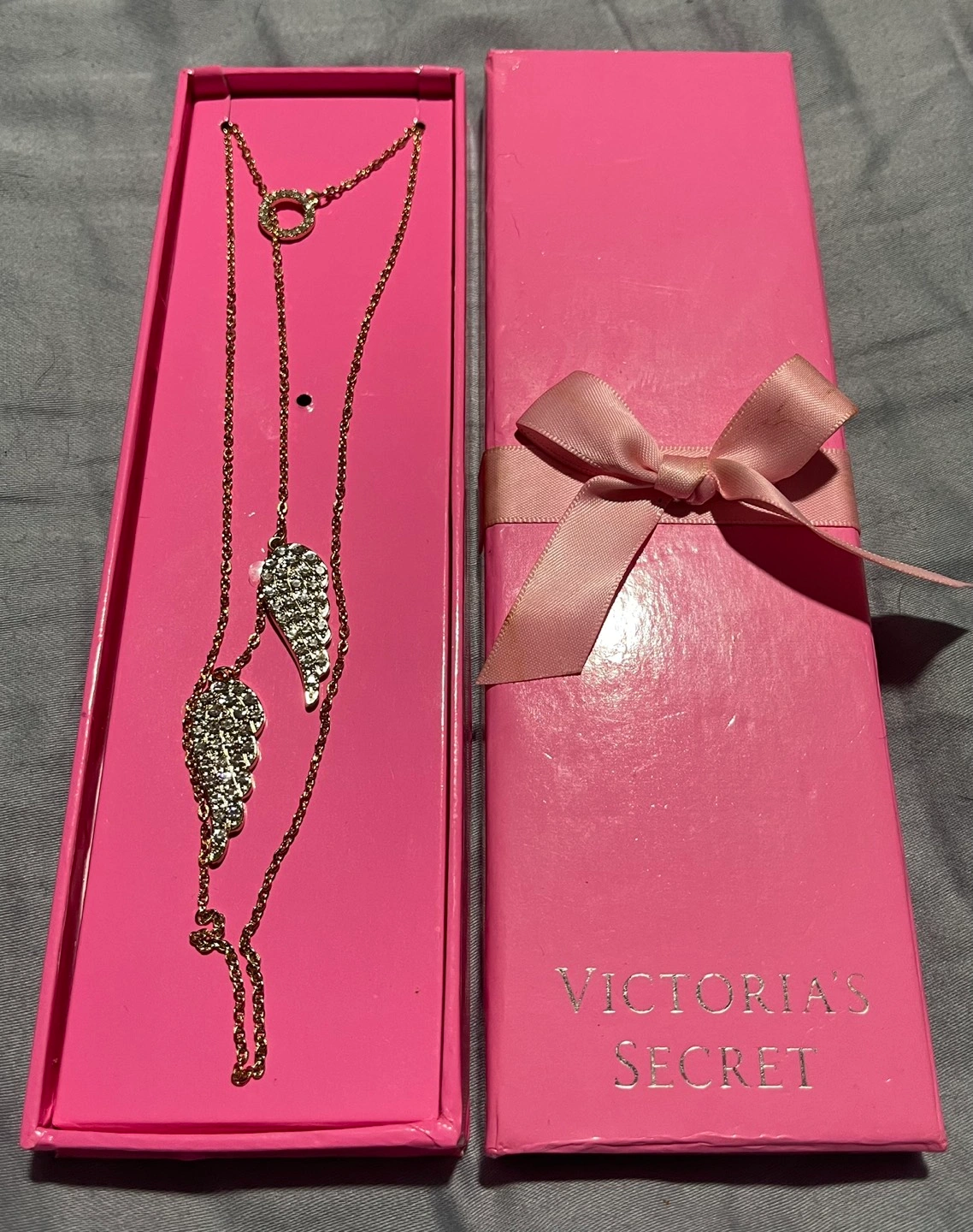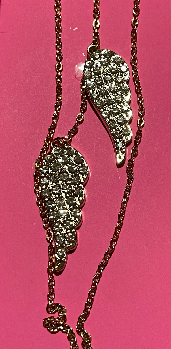 ITEM: Angel Wing Lariat Style Necklace Gold Tone with Rhinestone Studs on Angel wings. Comes in a Victoria’s Secret Gift Box.