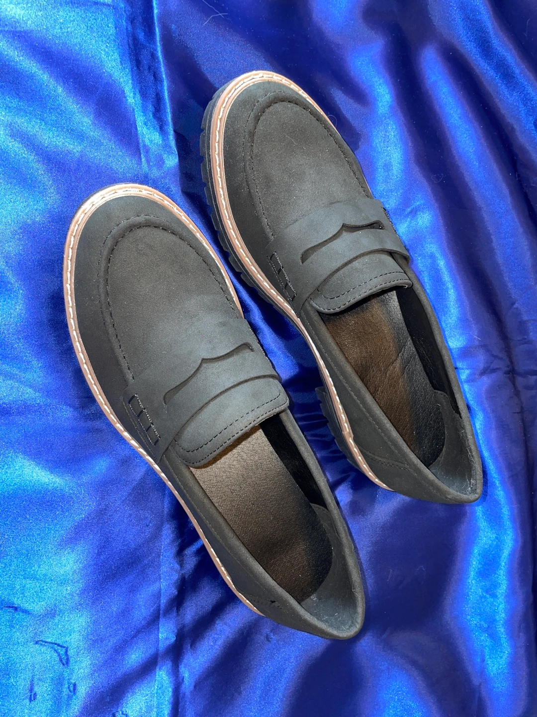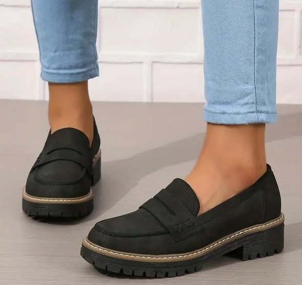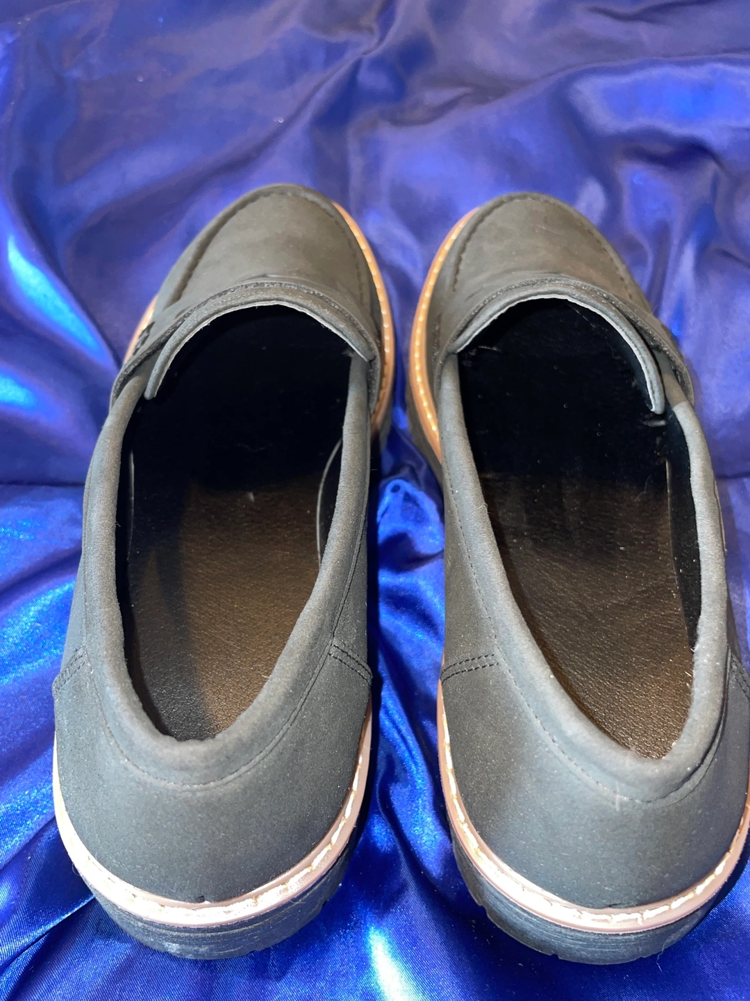 Black loafers with a thick sole. The size is about a 8 1/2- 9. (Closer to 9)