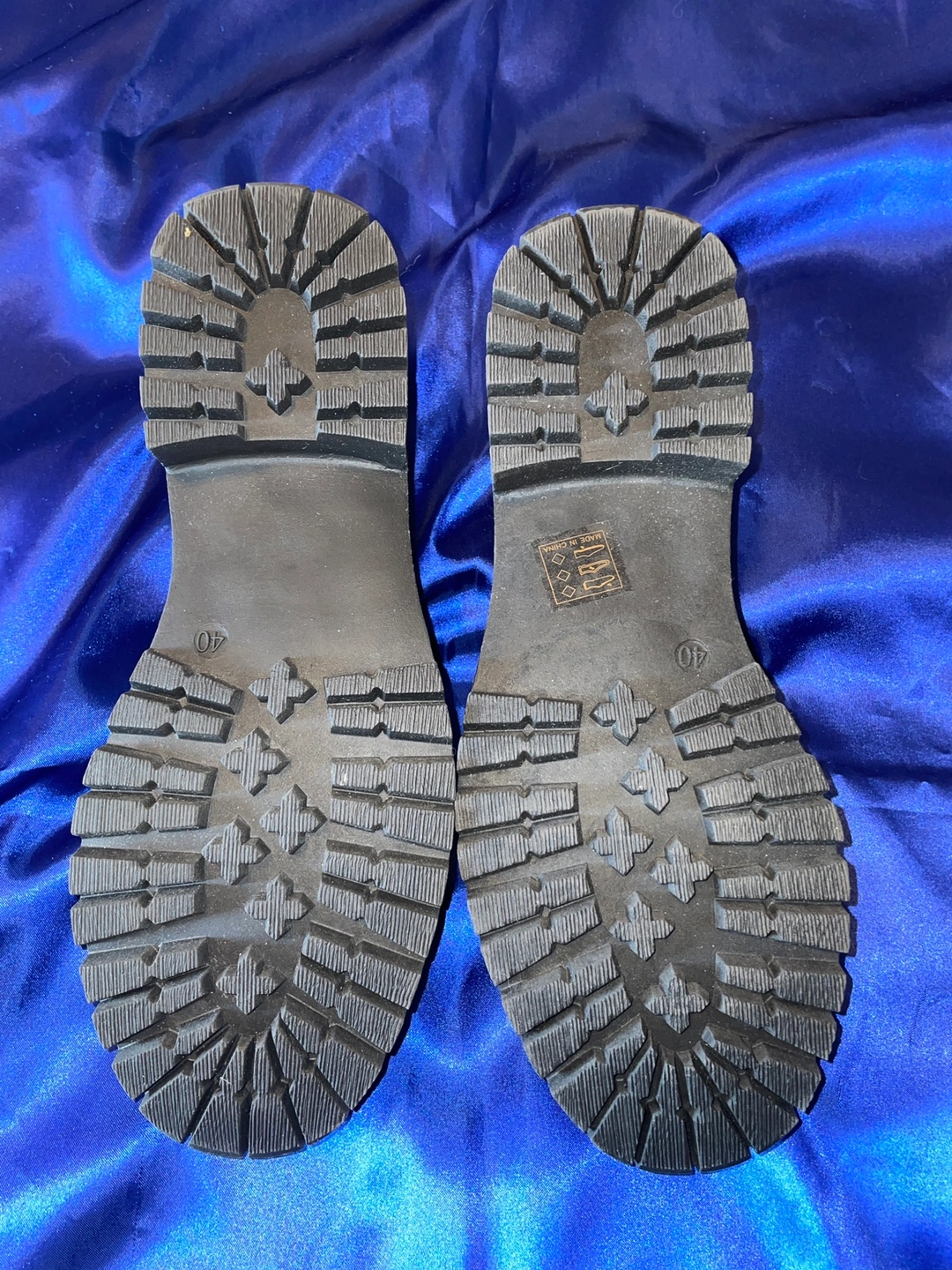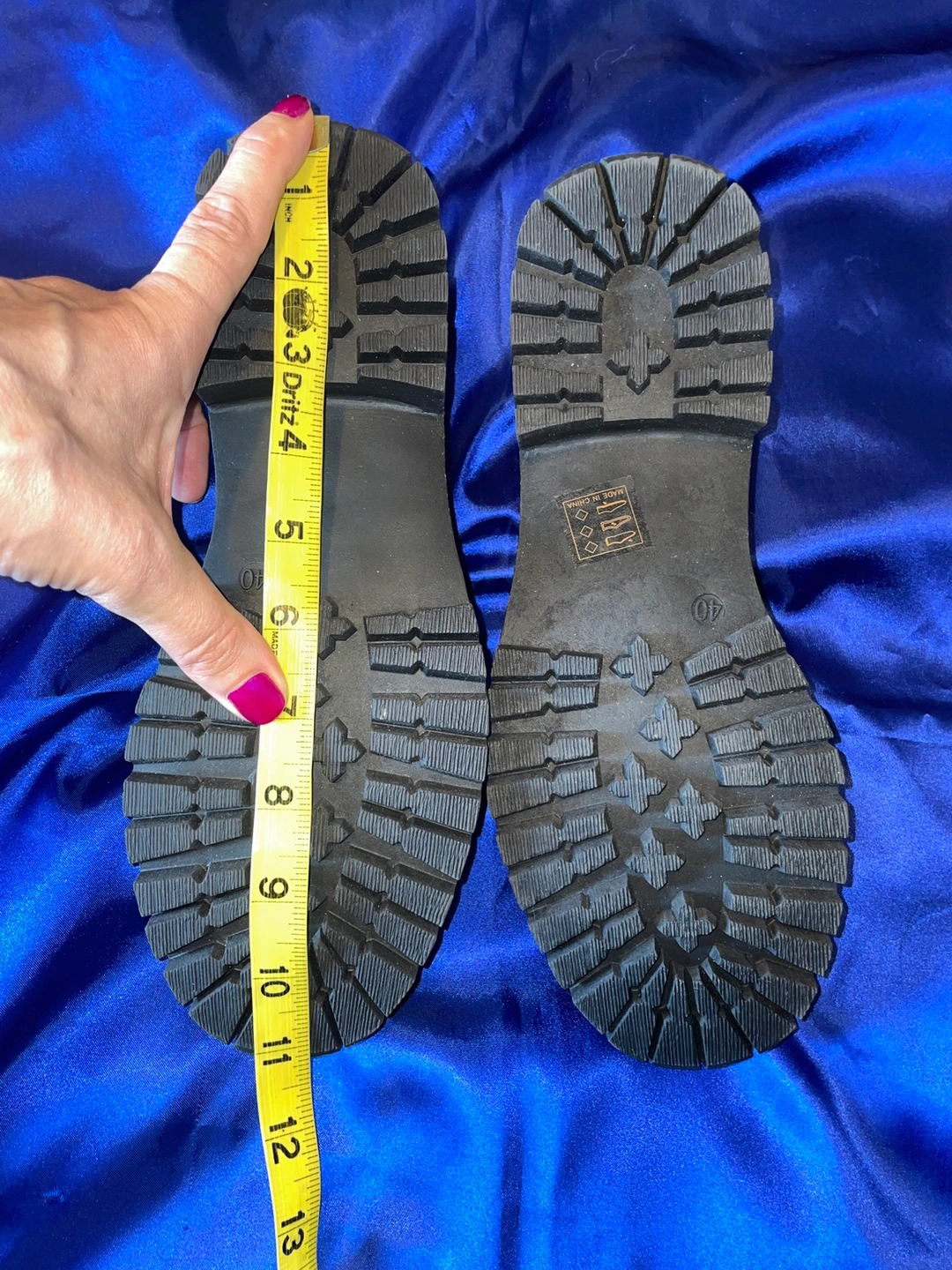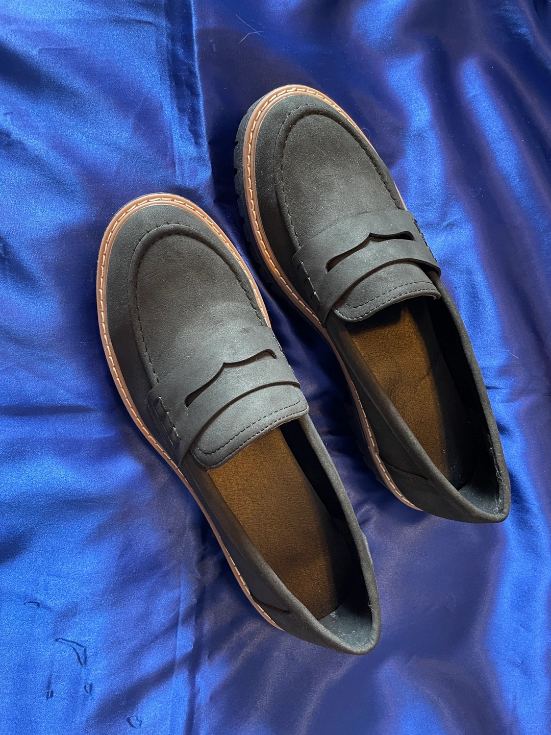 Black loafers with a thick sole. The size is about a 8 1/2- 9. (Closer to 9)