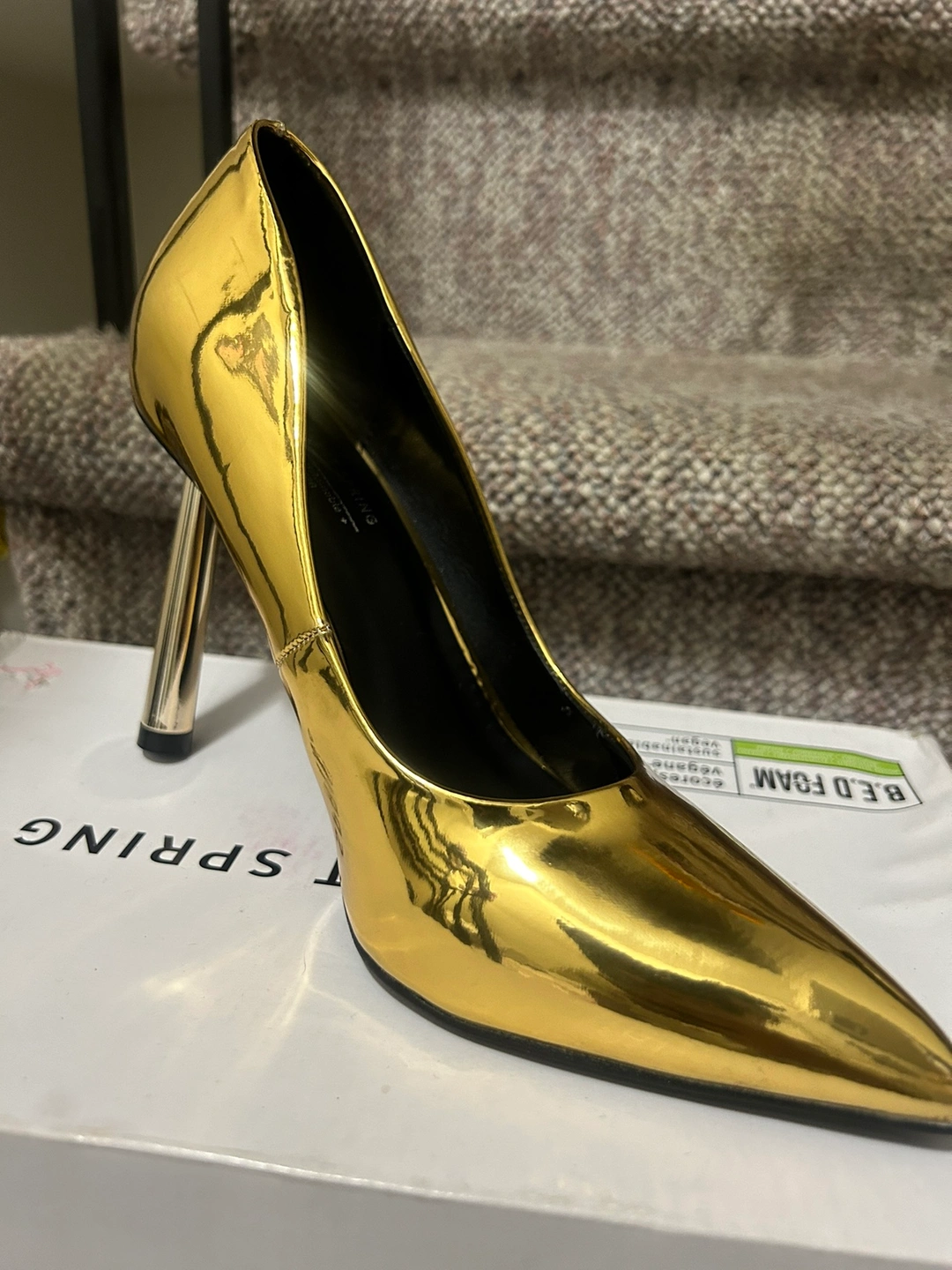 337These are a beautiful pair of gold pumps with a pointed toe and a tall heel. They are made of a shiny, metallic material and have a black lining. They are perfect for a night out or a special occasion. Never worn
