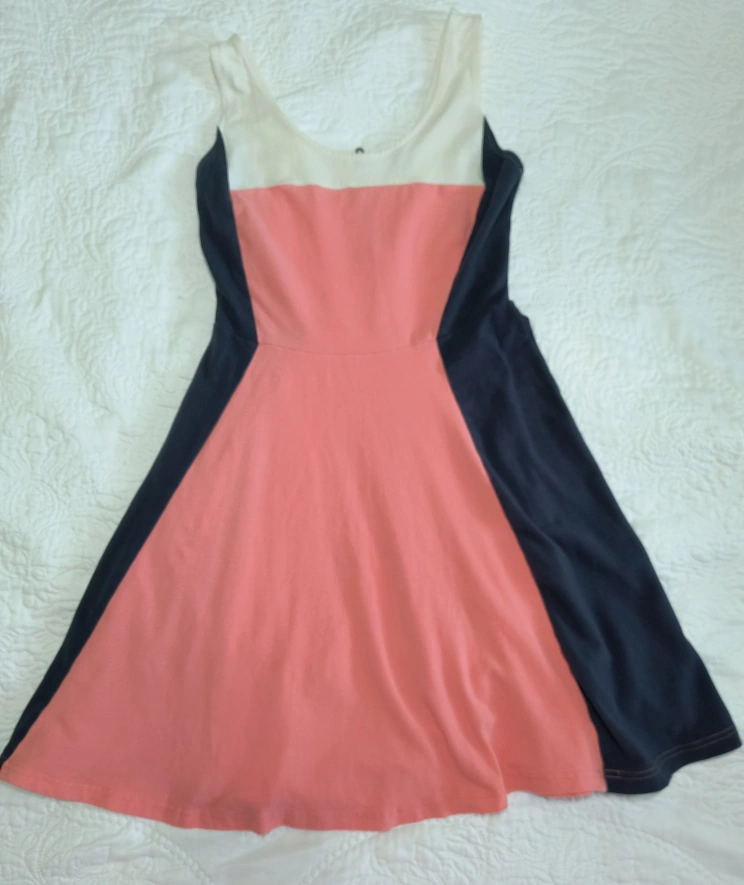 This dress is a sleeveless, colour block style with pink, white, and navy blue. It has a back zipper. The dress has a fitted bodice and a flared skirt. It is a comfortable and stylish dress for any occasion.