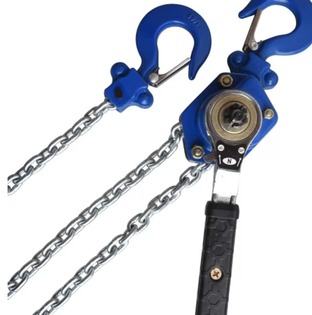Lift and lower heavy loads up to 10 ft with this lever chain hoist. It features a ratchet mechanism with a handle that rotates 360°, powder-coated steel construction and includes swivel hooks with safety latches.