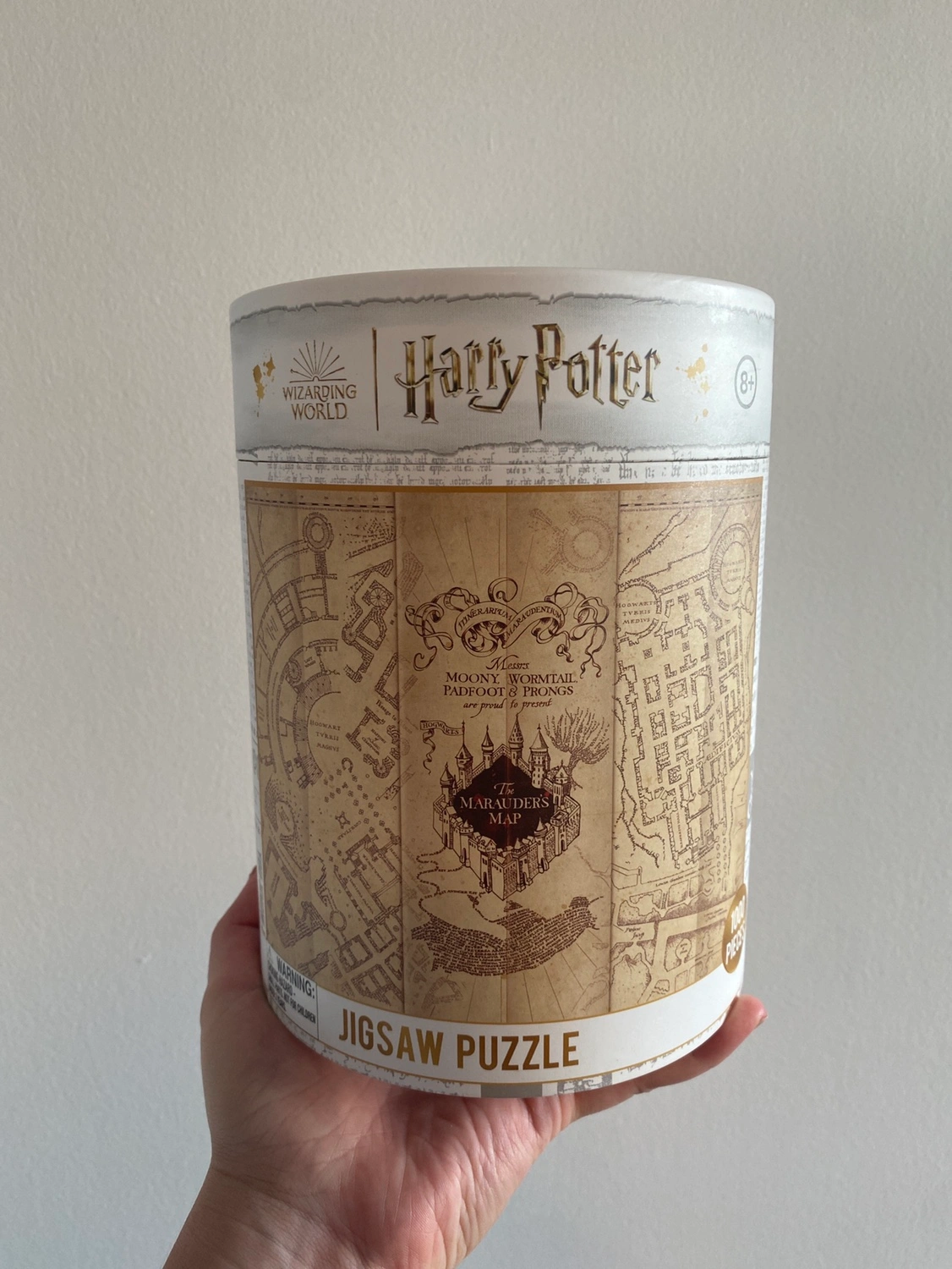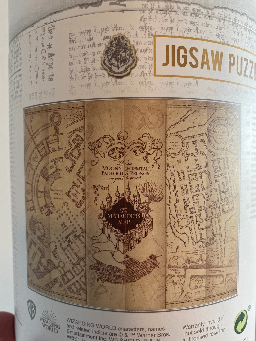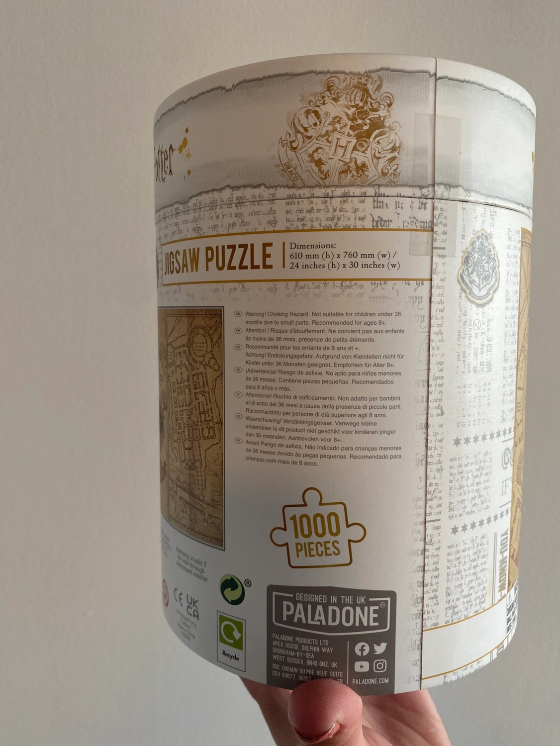This is a 1000 piece jigsaw puzzle featuring the Marauder's Map from the Harry Potter series. The puzzle is in brand new condition and has never been opened. The final puzzle size measures 24 inches (h) x 30 inches (w).