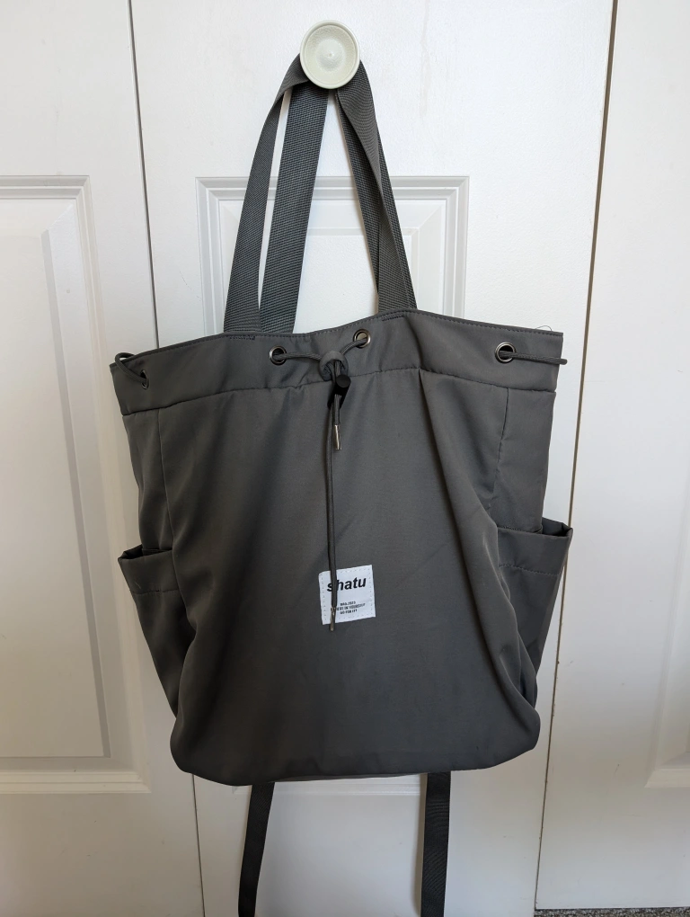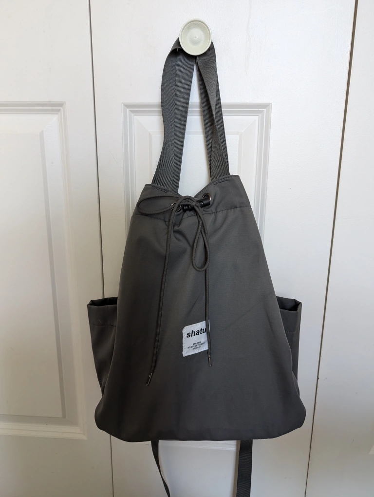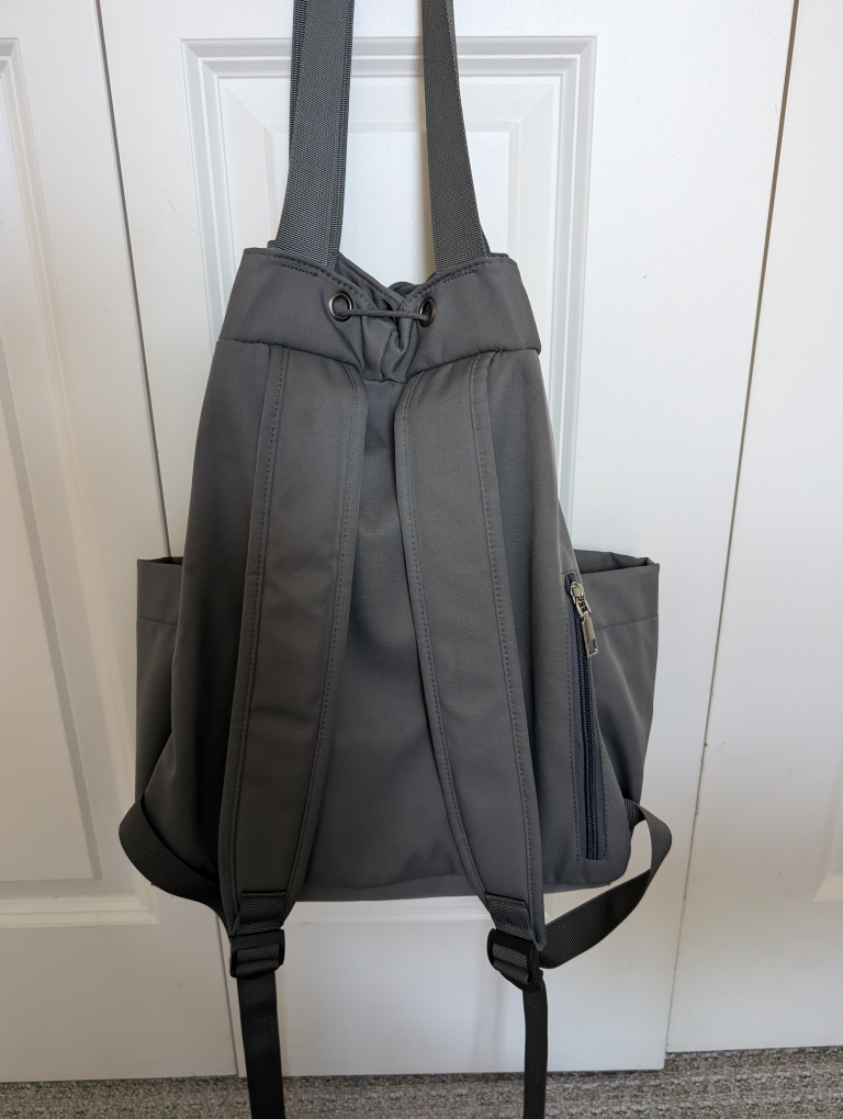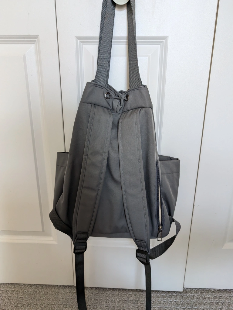 This backpack is grey and has a drawstring closure at the top. It has a zippered pocket on the front and has a strap that can be used as a tote handle. It can also be worn as a backpack with the adjustable straps.