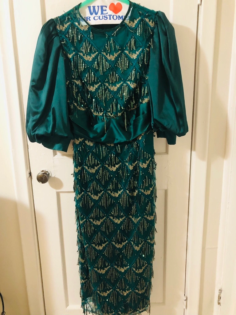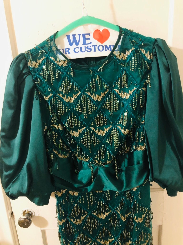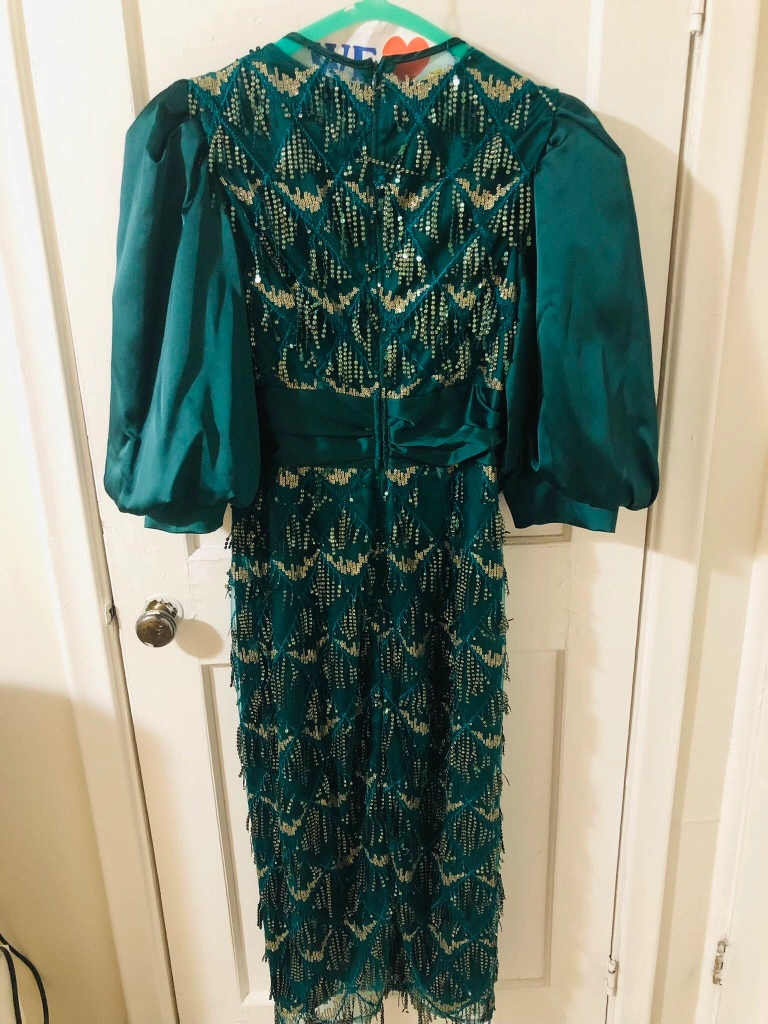 Beautiful green dress with gold sequins. The dress features puff sleeves and a ribbon accent at the waist. It is knee-length. Never worn, just dry cleaned it.