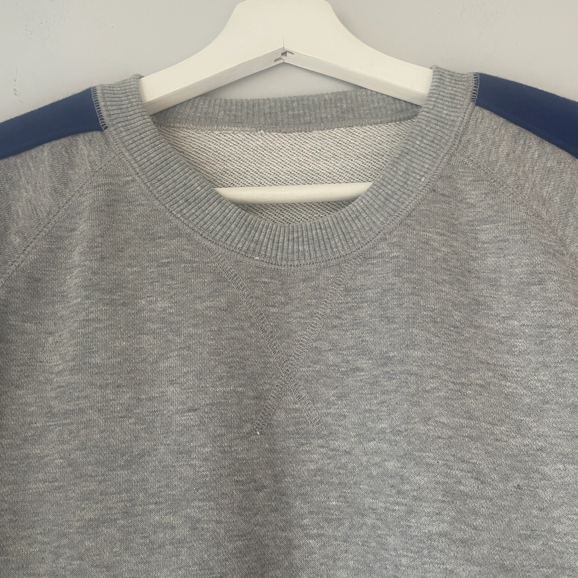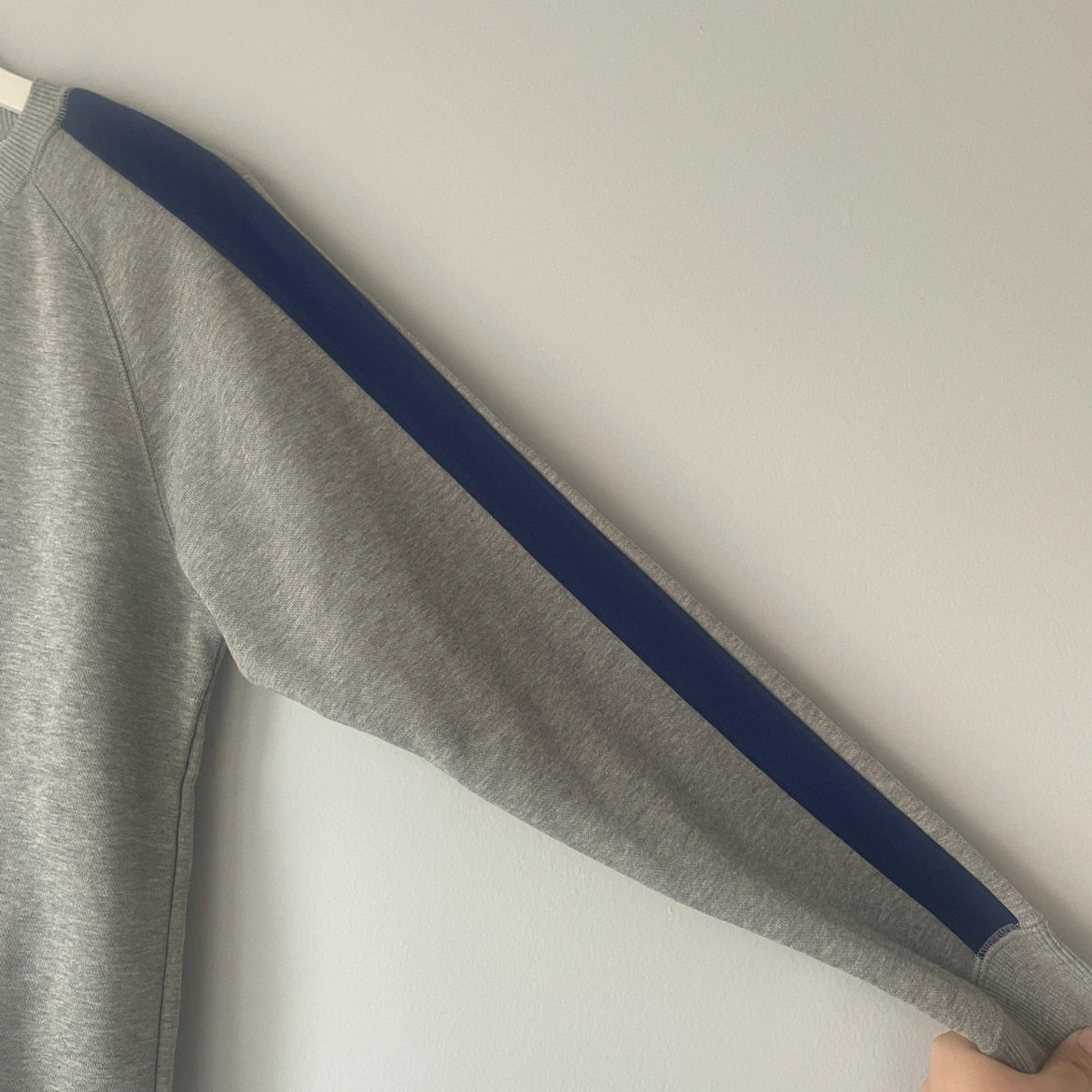 Grey soft crewneck with dark blue stripe down the sleeves.