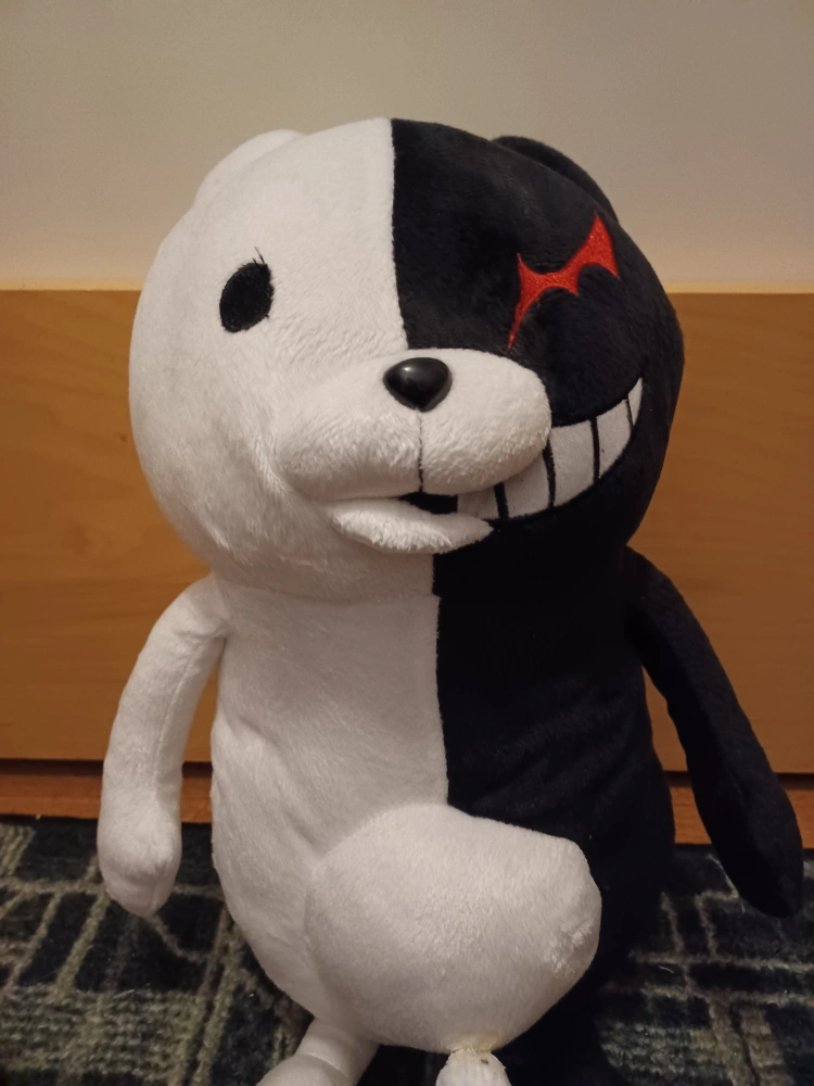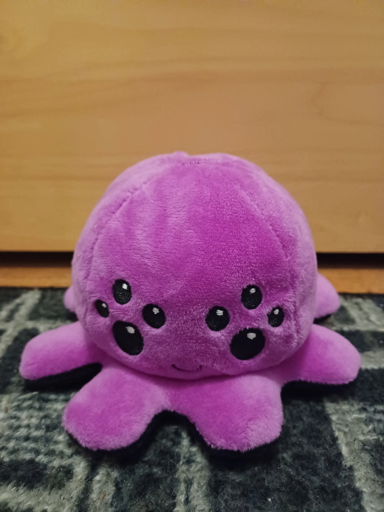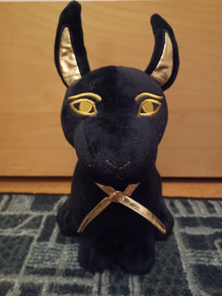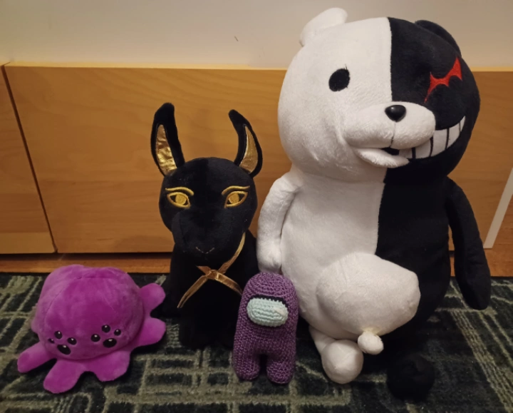 A bundle of four plush toys, including a purple octopus, a black Anubis, a purple Among Us character, and a black and white bear from the series Danganronpa. The price listed is for all 4!