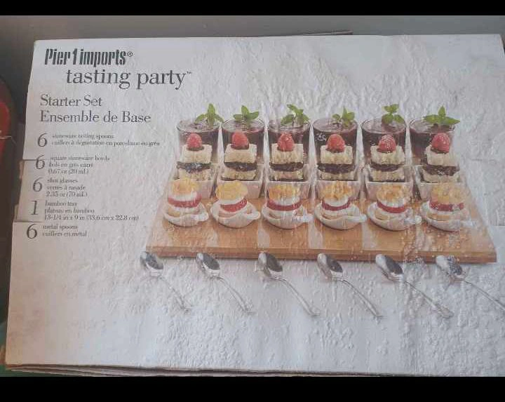 This set includes several small dishes, spoons and a bamboo board for all your fancy party needs!