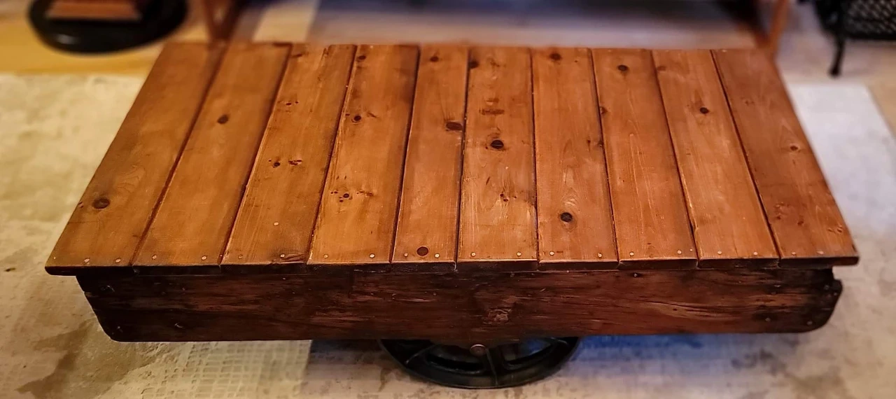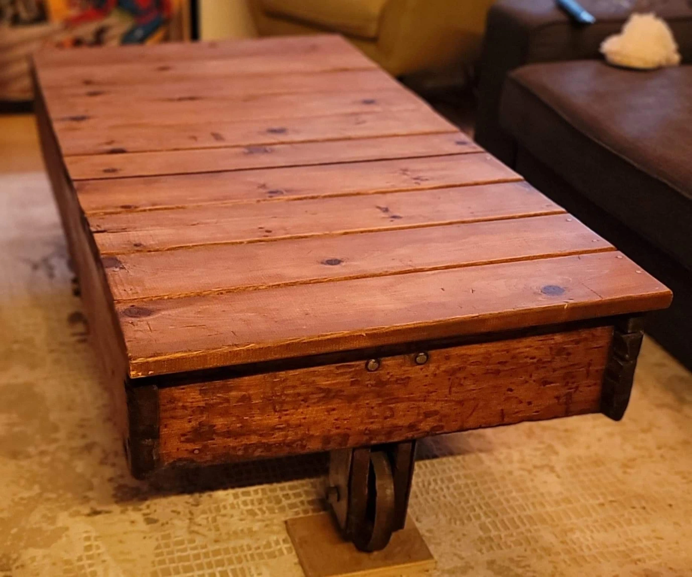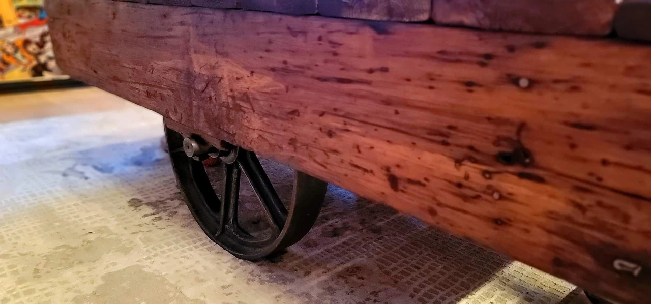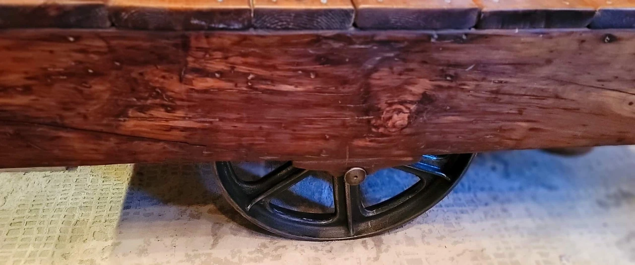 Genuine antique rail cart used to move whisky barrels circa late 1800s. Functioning steel wheels, and original wood on the sides. the table top planks were replaced once. Good, antique condition with beautiful patina.