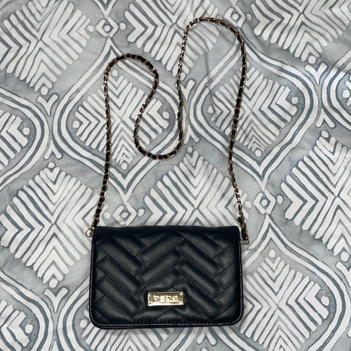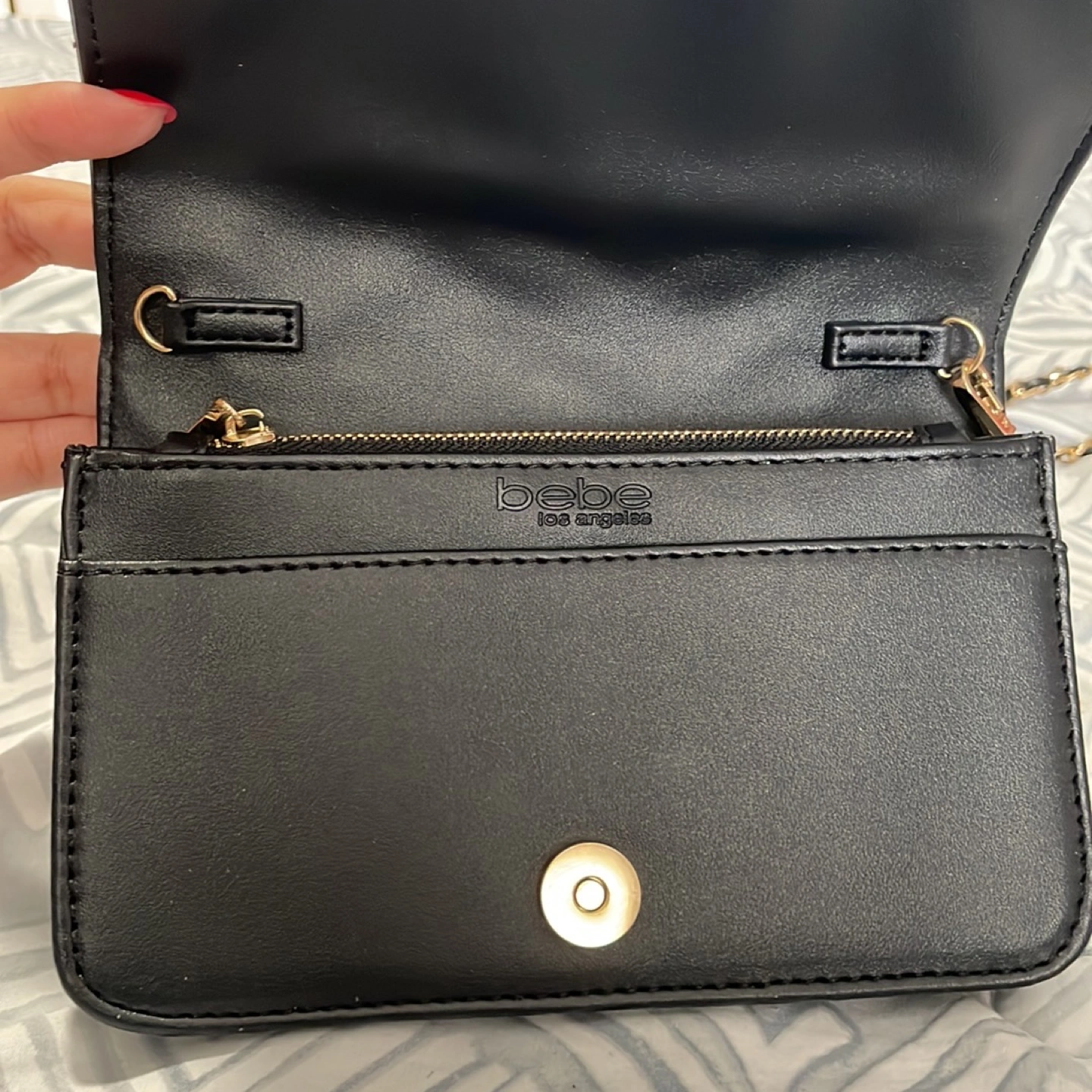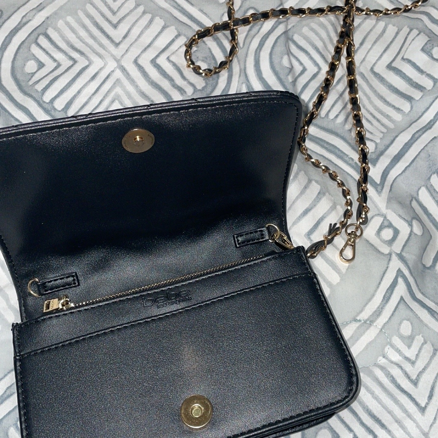 Preloved BEBE cross body purse with black and gold chain detachable strap-can also be used as a clutch! Has 3 main pockets and 6 inner card slots. Overall great mint condition, no flaws.