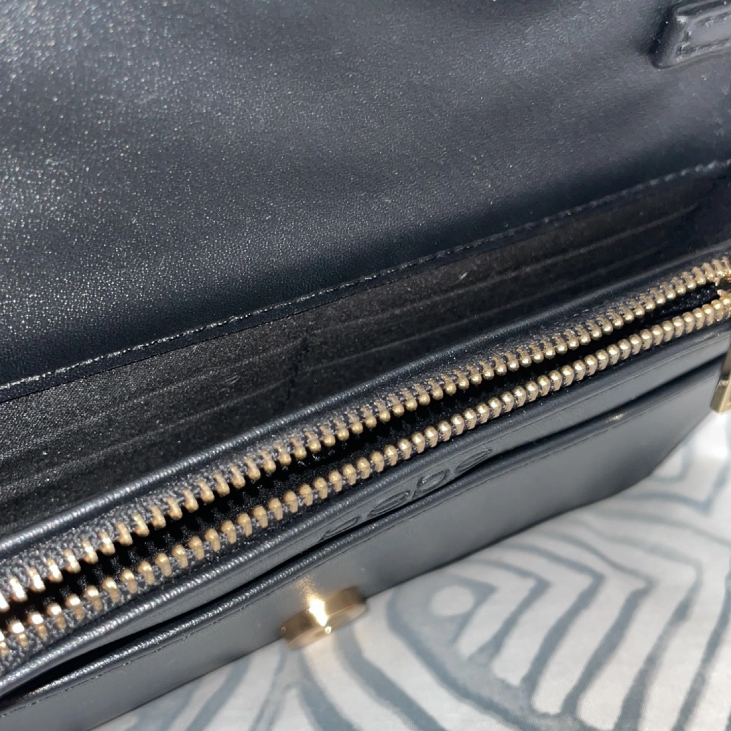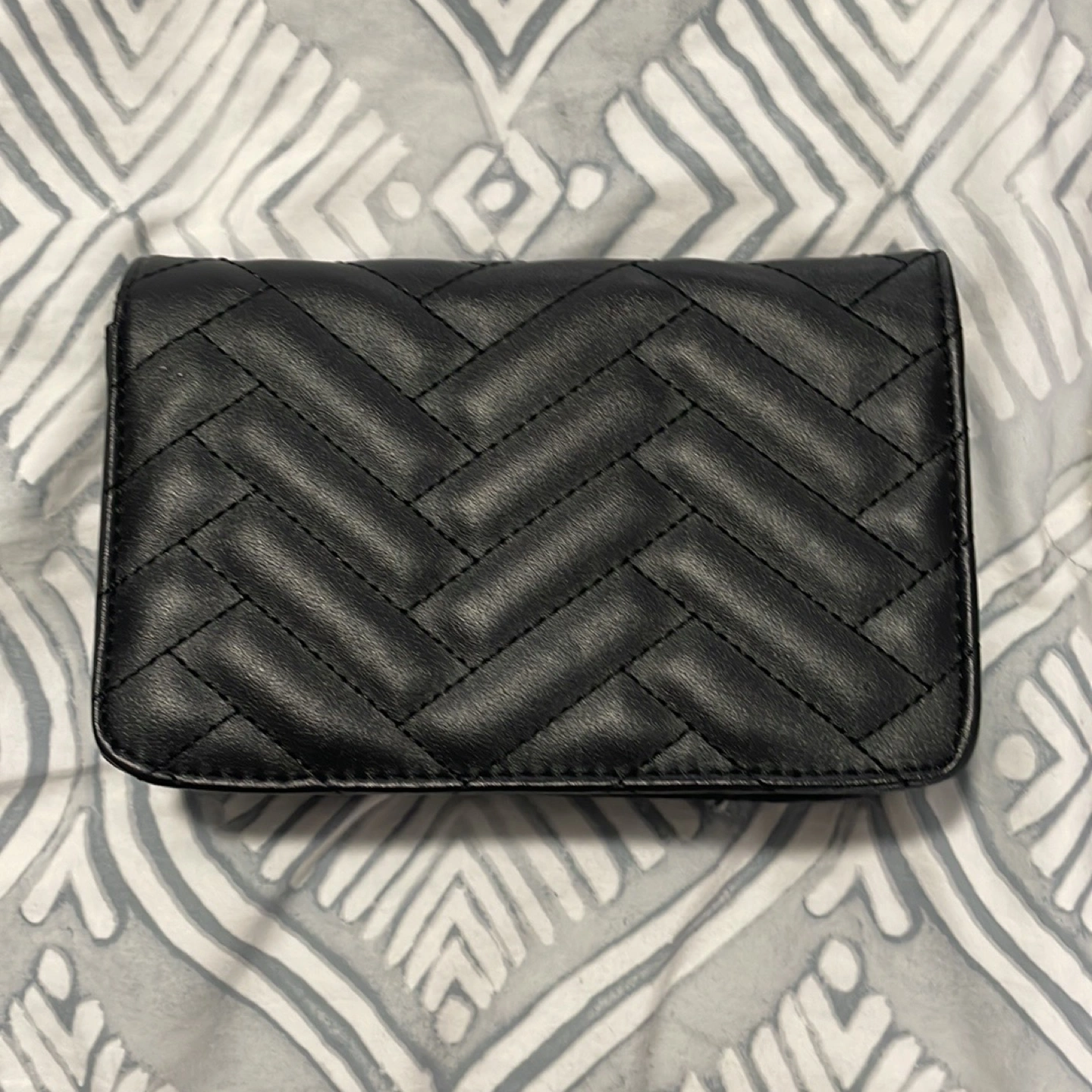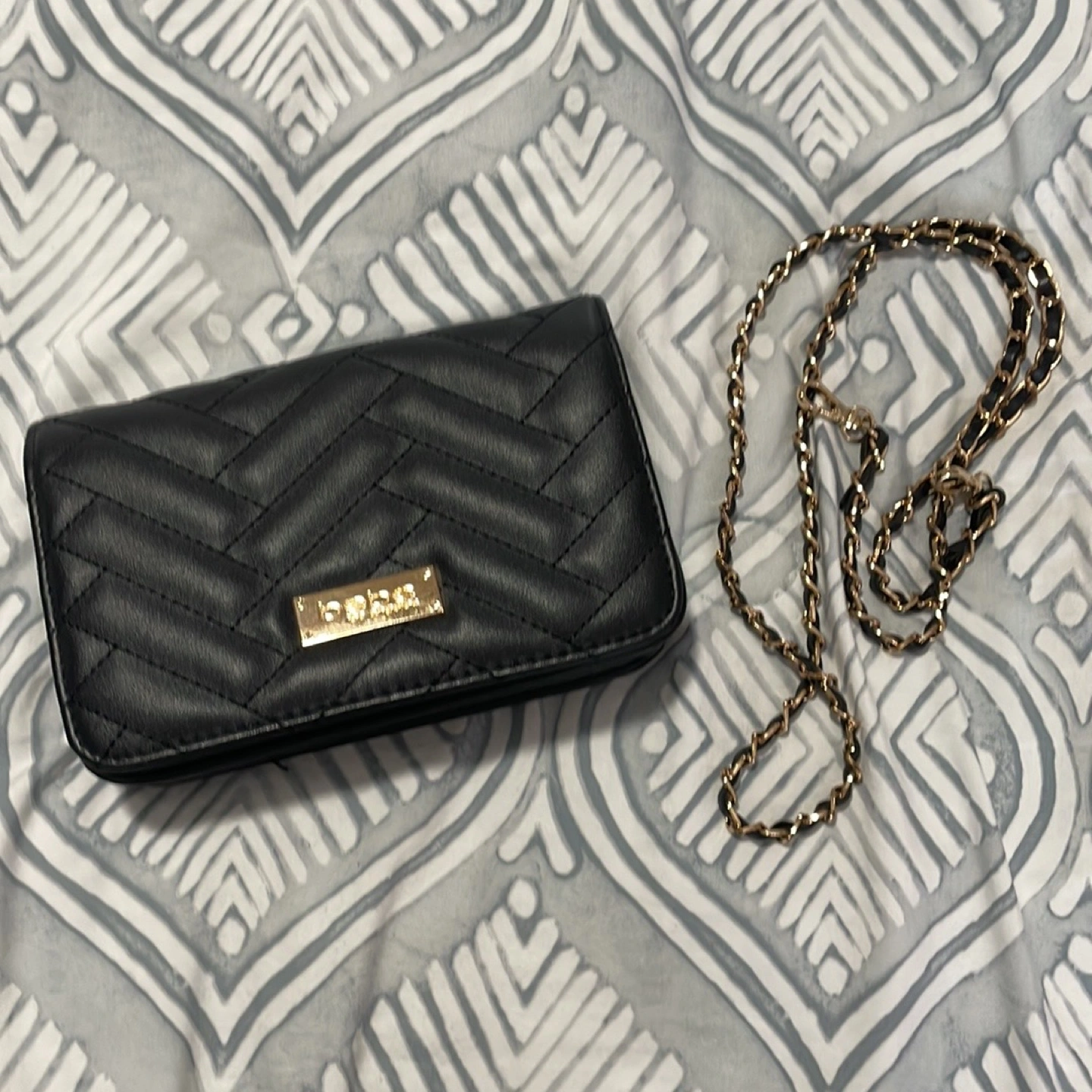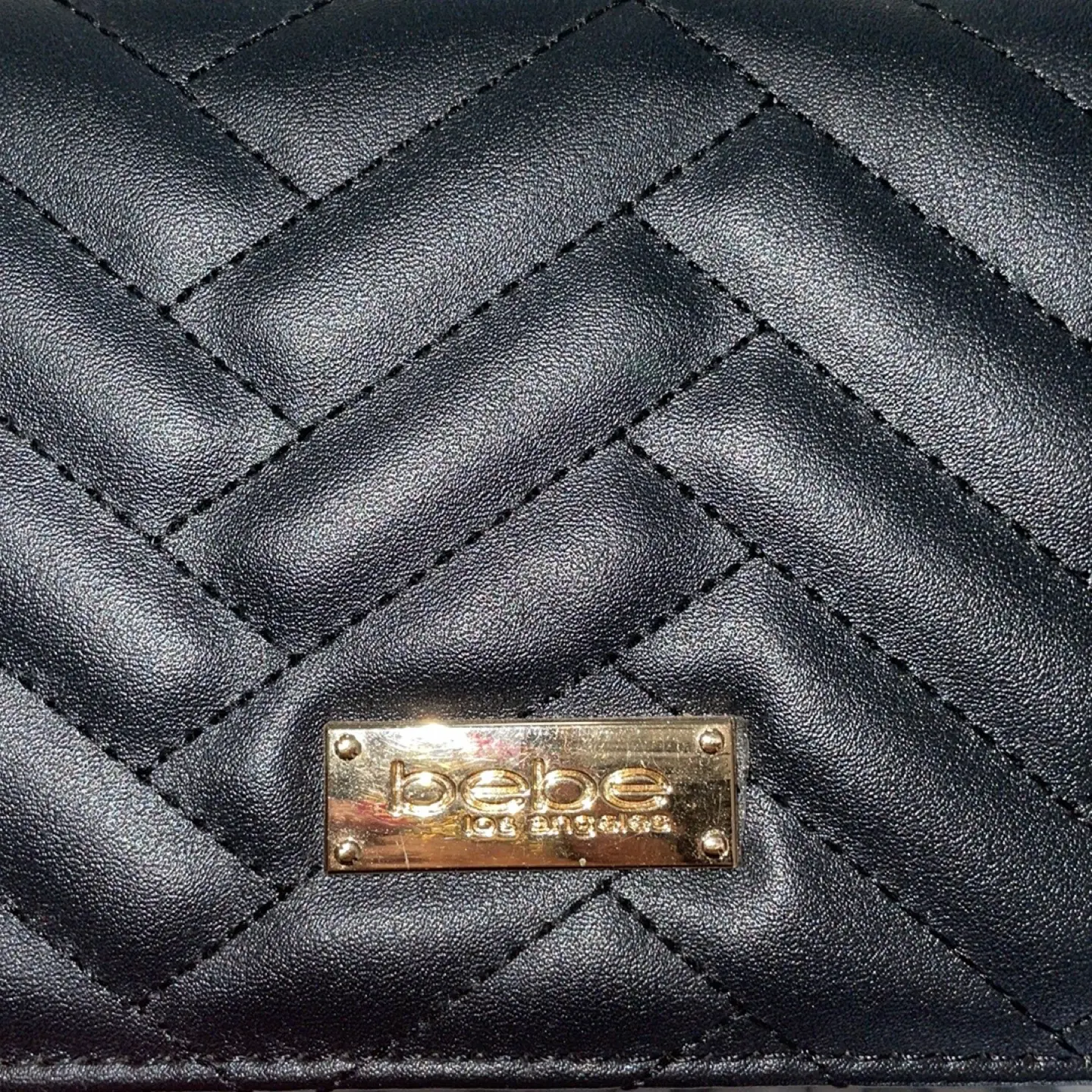 Preloved BEBE cross body purse with black and gold chain detachable strap-can also be used as a clutch! Has 3 main pockets and 6 inner card slots. Overall great mint condition, no flaws.
