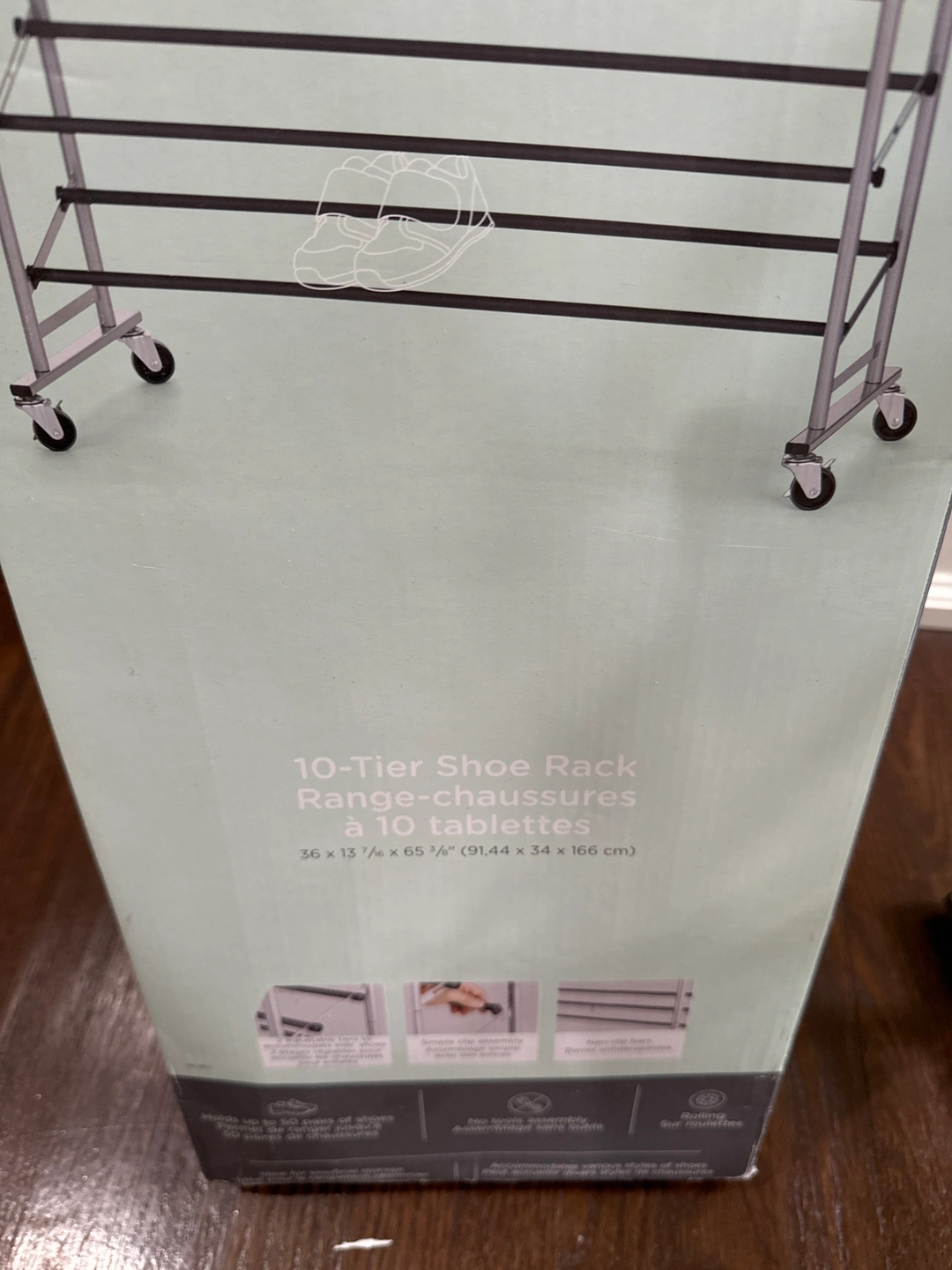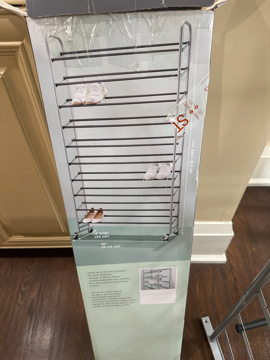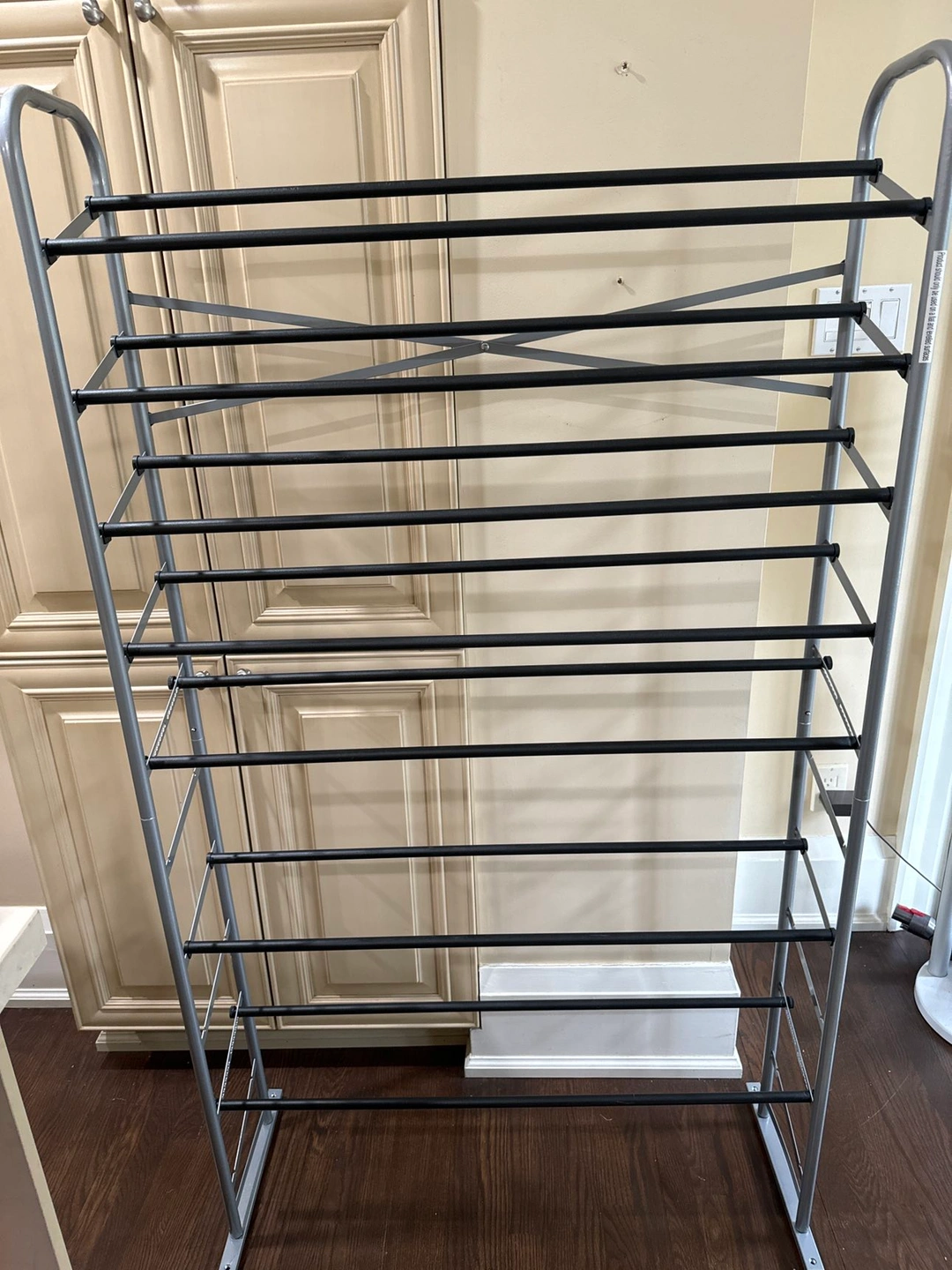 Shoe rack currently on sale at Cdn tire for $44.99. Will be boxed for pick up. Cash only. Easy assembly, no tools required https://www.canadiantire.ca/en/pdp/type-a-radiant-metal-adjustable-10-tier-shoe-rack-holds-up-to-50-pairs-of-shoes-black-0687886p.html