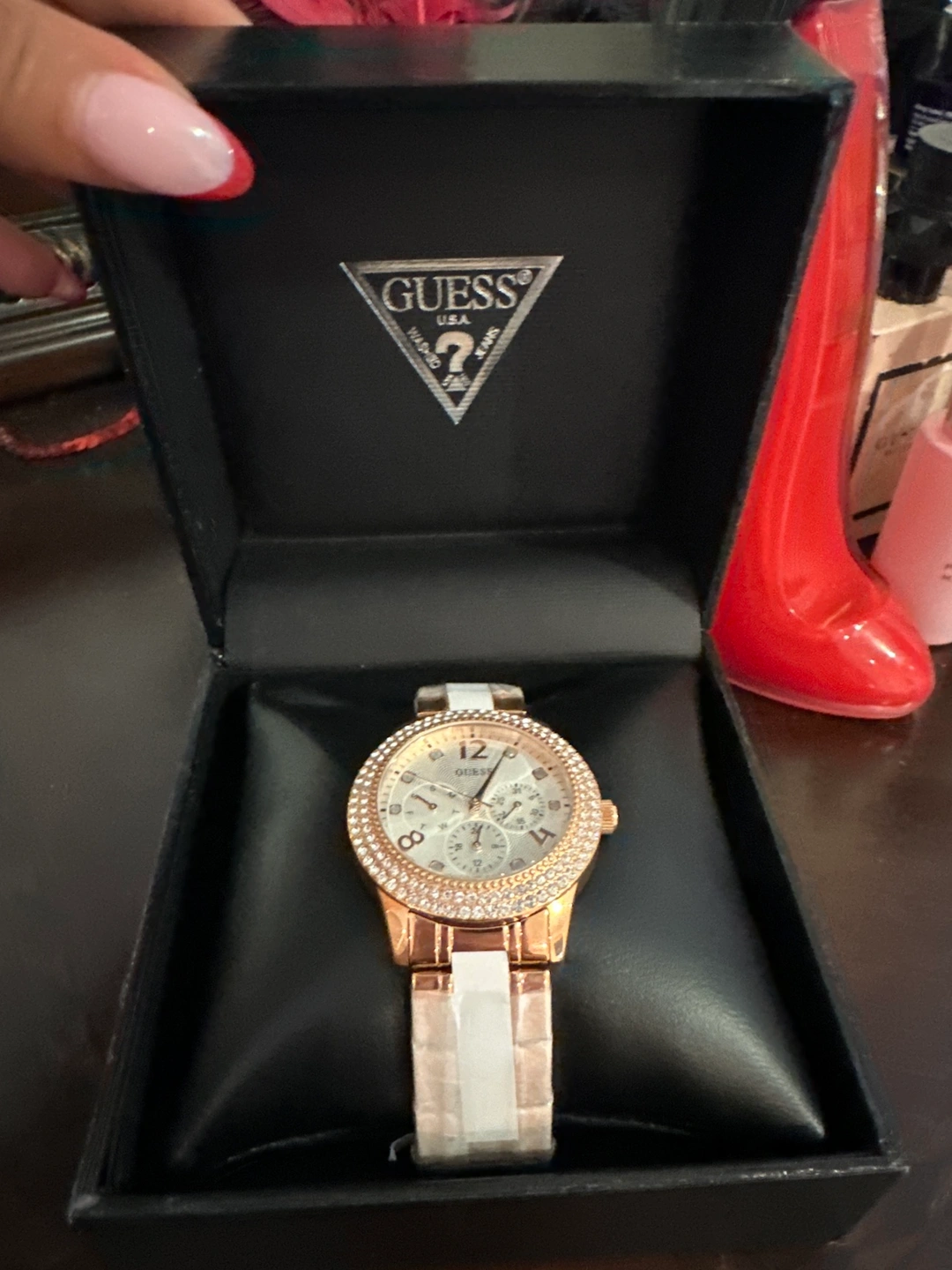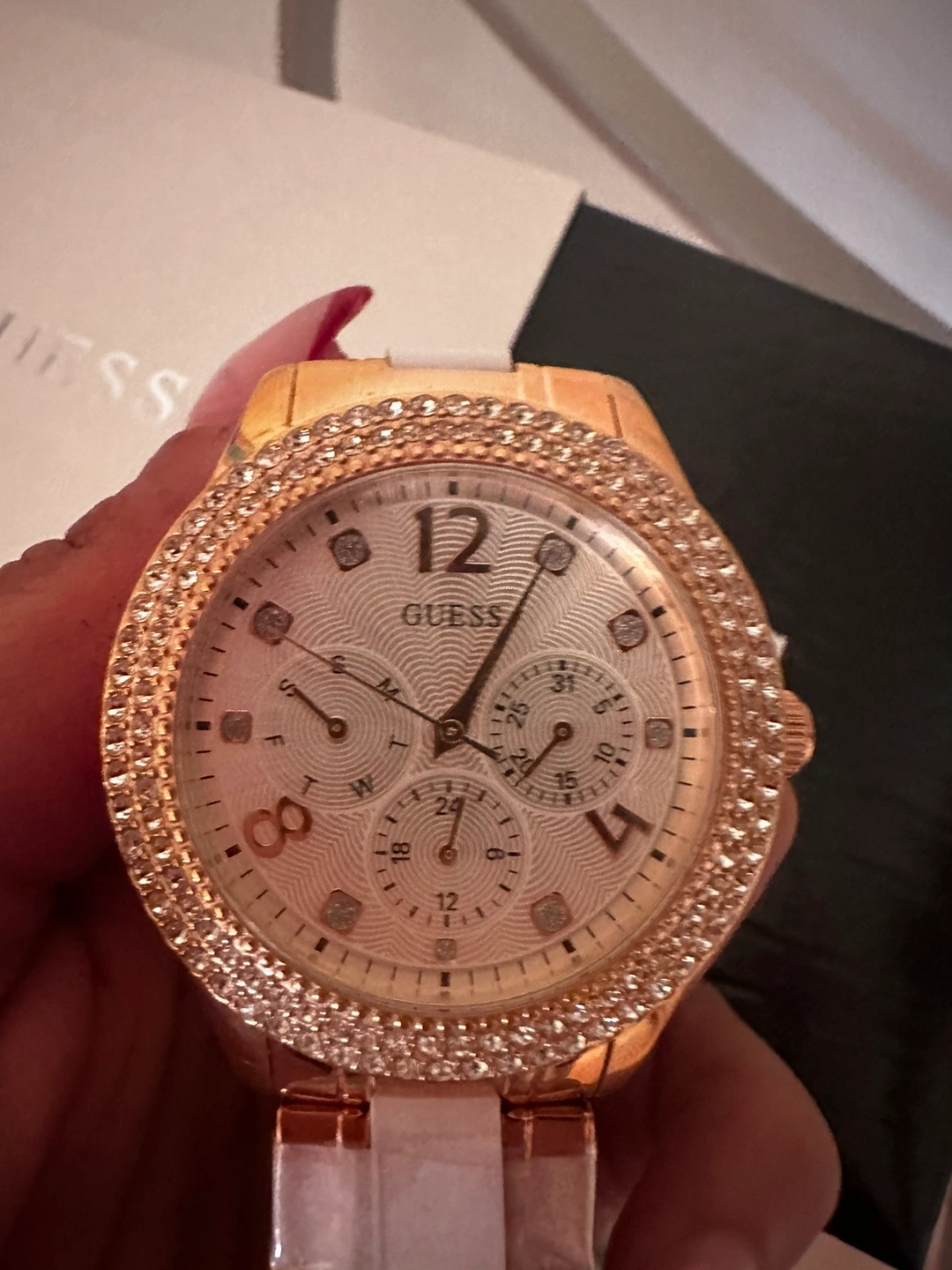 A brand new rose gold watch with diamonds . Received as a gift but never used it ! Comes with a box ! Only need to put a battery which will cost 10 bucks only ! Then you ready to go 😉