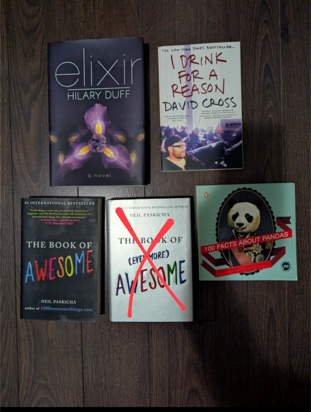 372The following books are for sale, $5 each: - I Drink For A Reason by David Cross (softcover) - The Book of Awesome by Neil Pasricha (softcover) - [SOLD] The Book of Even More Awesome by Neil Pasricha (hardcover) - Elixir by Hilary Duff (hardcover) - 100 Facts About Pandas (softcover) Price is firm, cash only (i.e. NO e-transfers). Pick up only (i.e. NO shipping). Pick up location: East York - near Bermondsey Rd. & O'Connor Dr. intersection