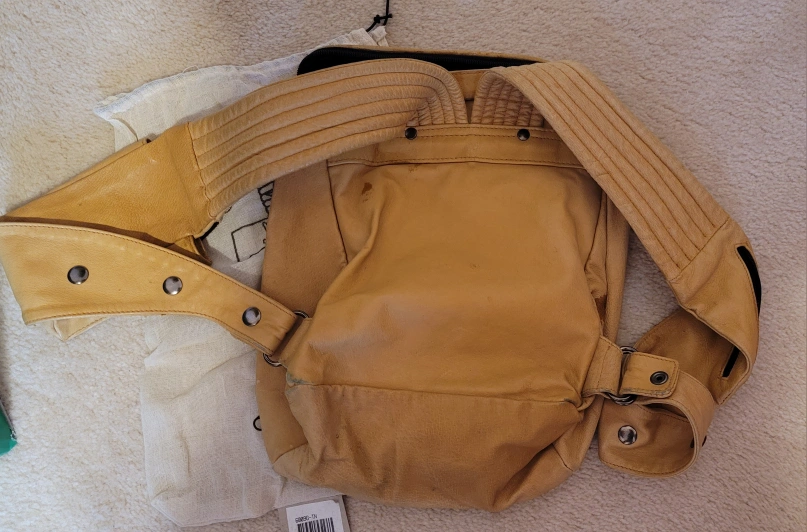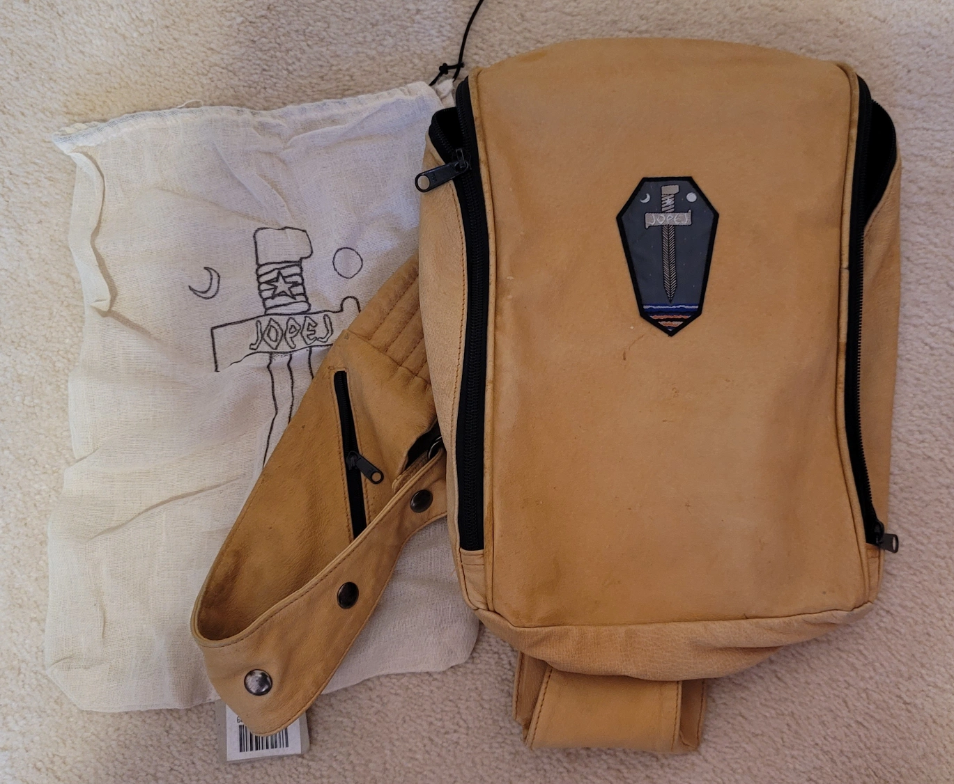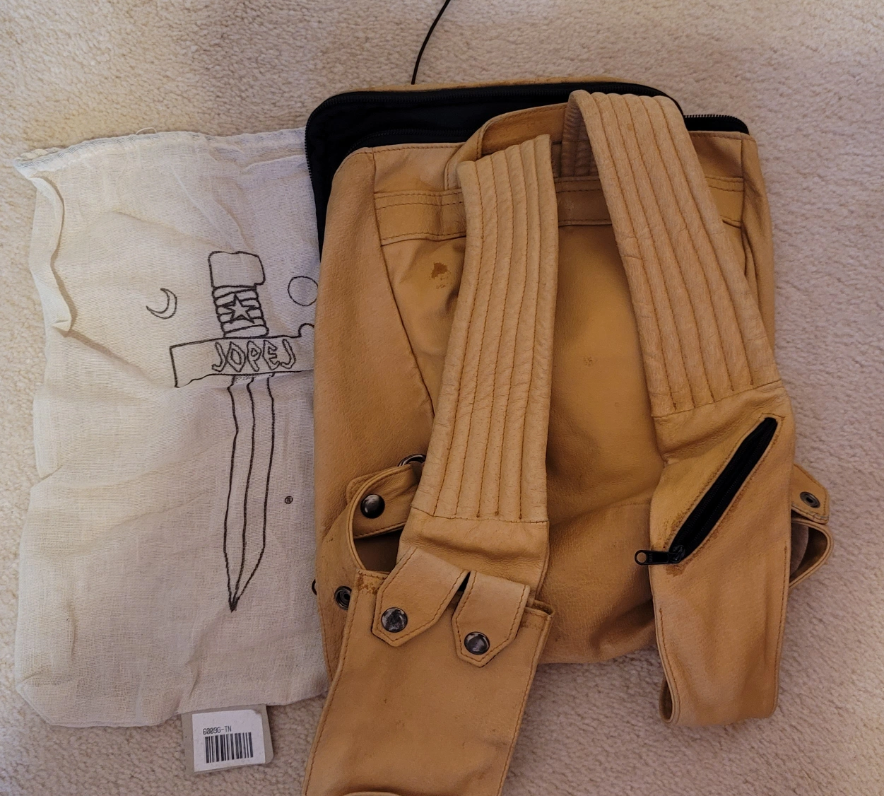 This is a leather backpack with a unique design. It has a pocket on the front, and a pocket on the back. There is also a large pocket on the inside. It includes a dust bag.