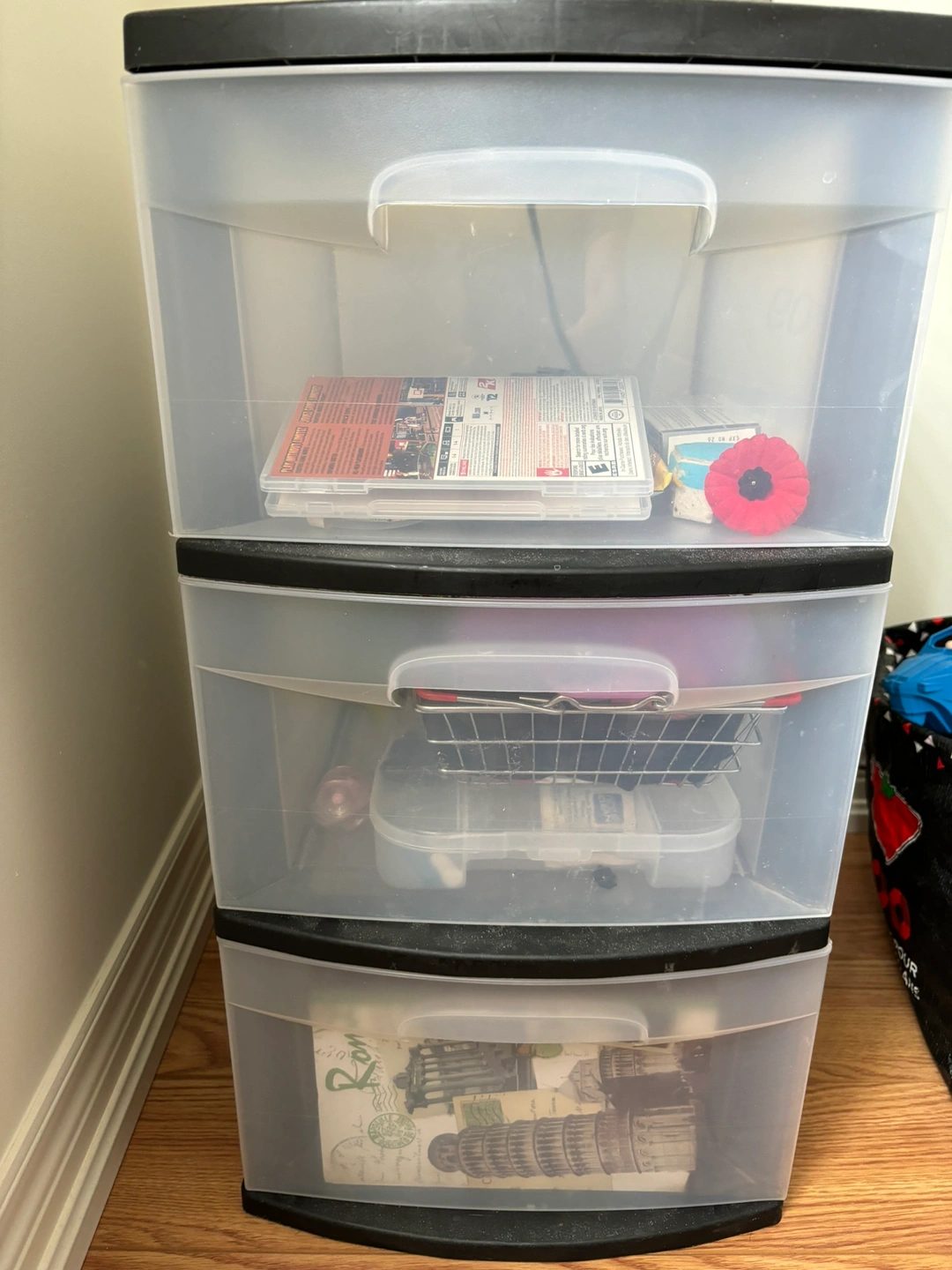 Clear plastic drawers with 3 levels size is 12.5 inch wide x 13 inch depth x 23 inch high Note: accessories pictured are NOT included Please allow a reasonable amount of time to arrange pick up. Cash and pick up only