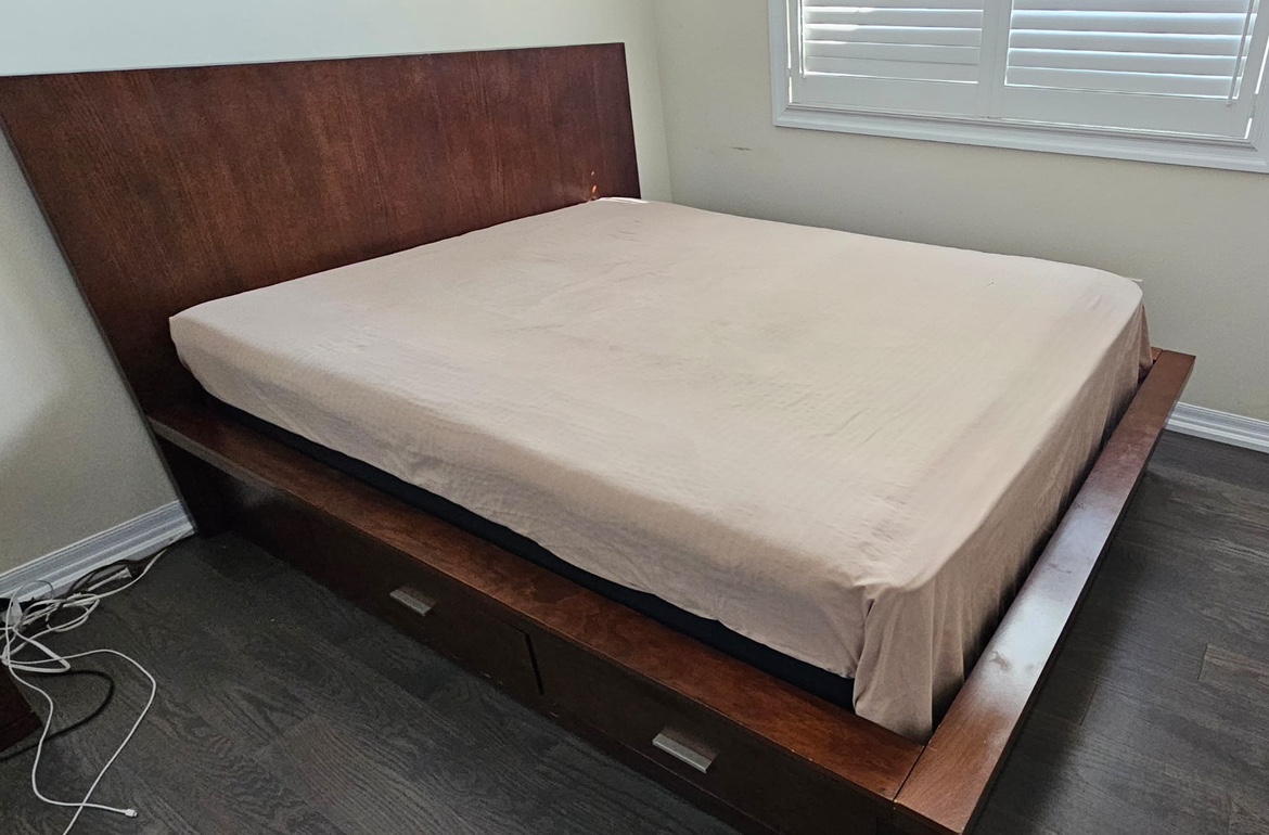 Solid wood, multiple drawers in the bottom on both sides of the bed. Comes with free mattress and boxspring if you would like to have them. Great condition.