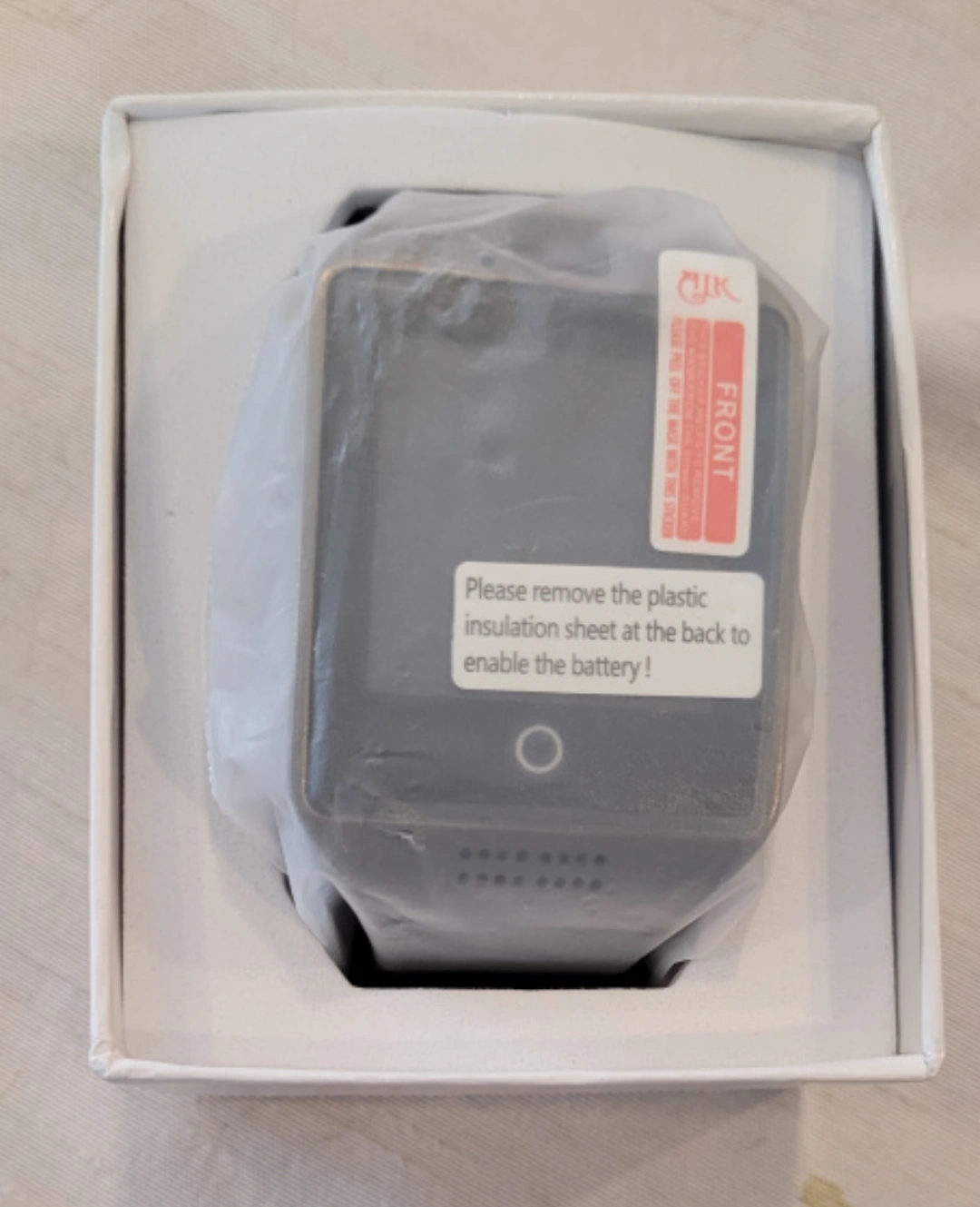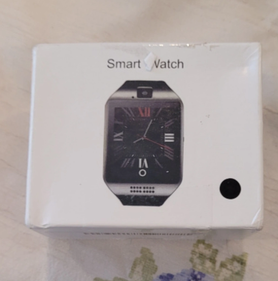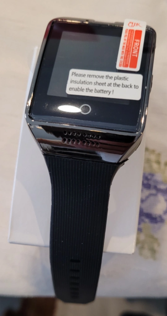 This smart watch is in its original packaging. It has a black band and silver casing. The screen is a square shape.Generic Original Q18 with Camera TF/SIM Card Slot Bluetooth Smartwatch Smart Phone for Android and iOS Black