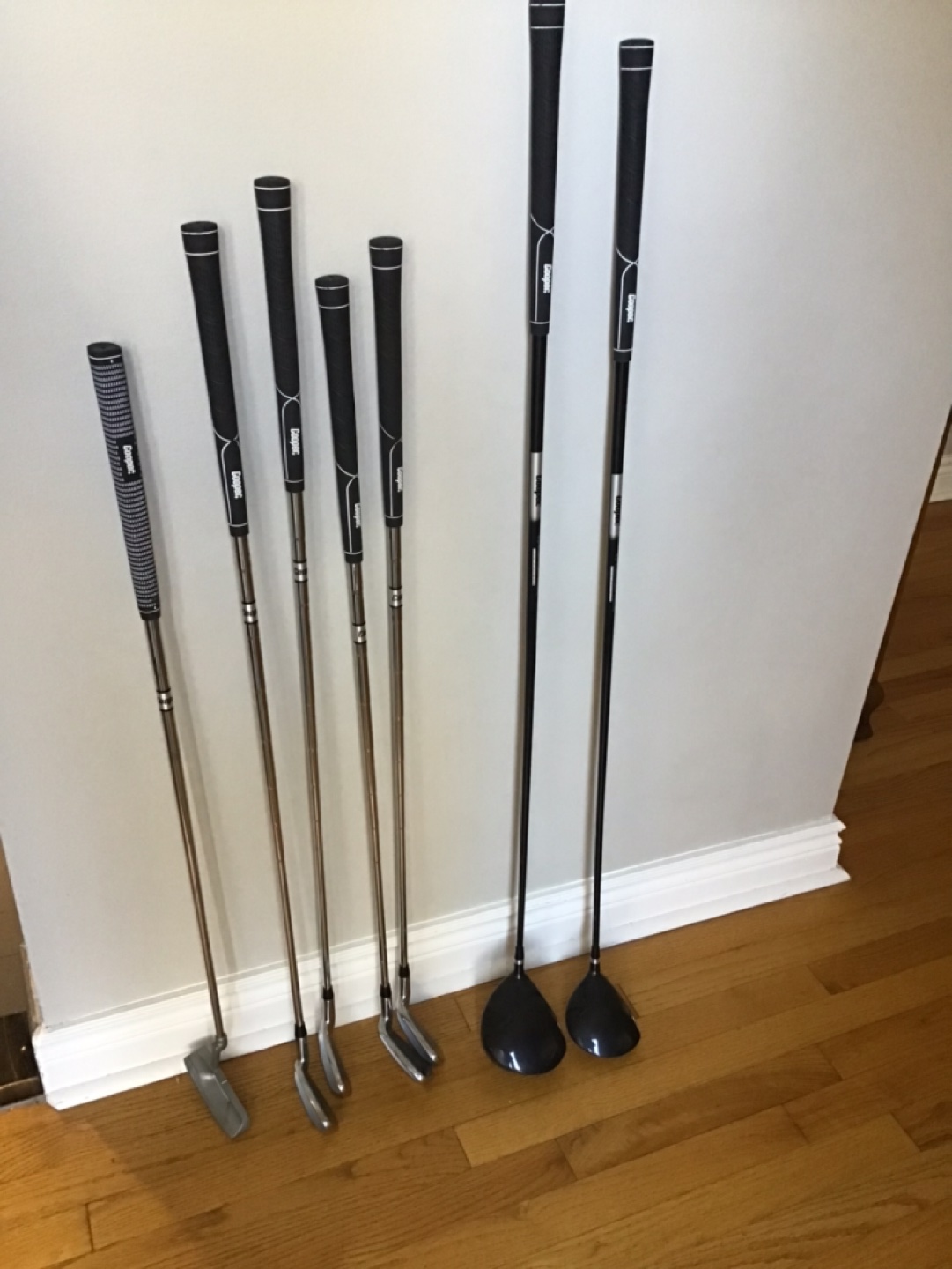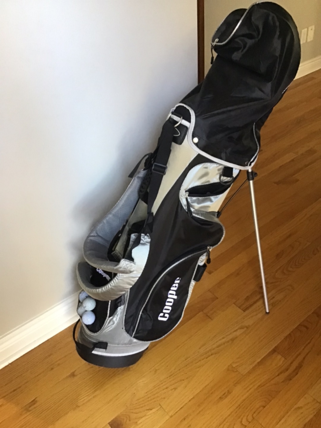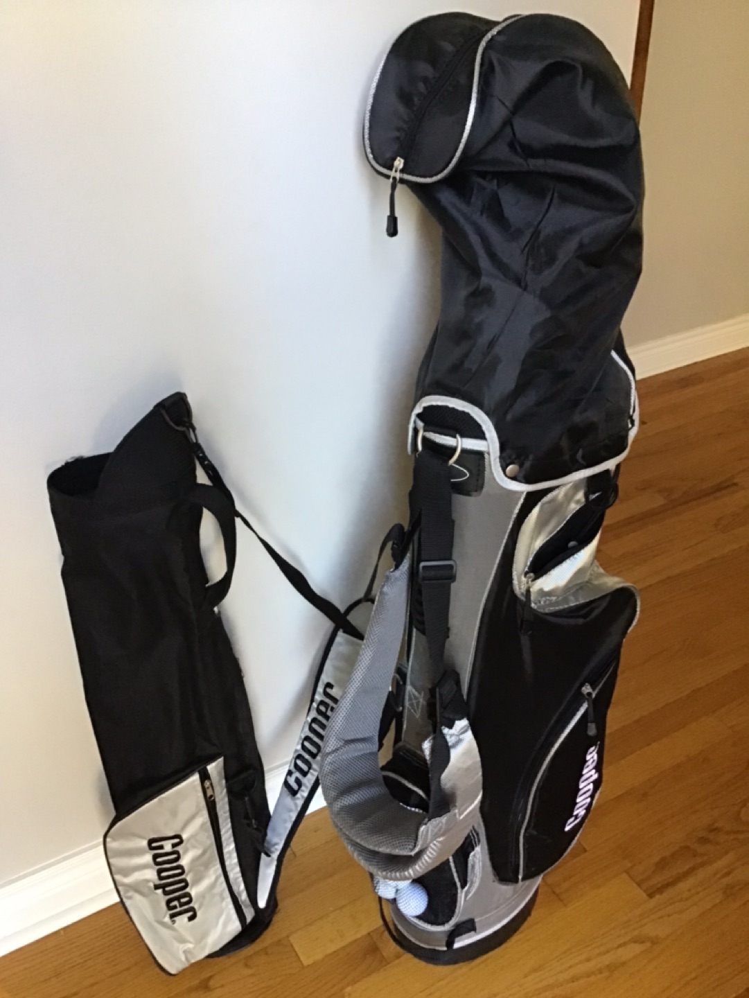 131Cooper golf clubs - 5 irons, two woods in bag plus shoulder bag and golf balls.