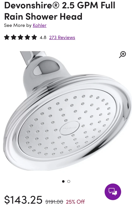 Devonshire® 2.5 GPM Full Rain Shower Head Description Features Optimized spray face for maximum performance Master clean spray nozzles prohibit mineral build-up for easy cleaning. Katalyst Spray Technology with air induction ball joint (patent pending). 2.5 gpm (9.5 pm) maximum flow rate at 45 psi condition brand new Danforth and Eglington Pick up only