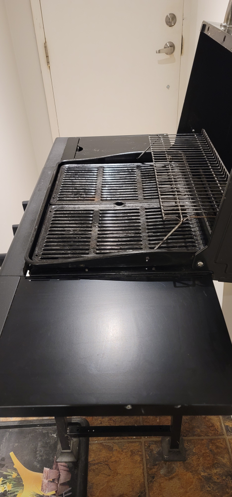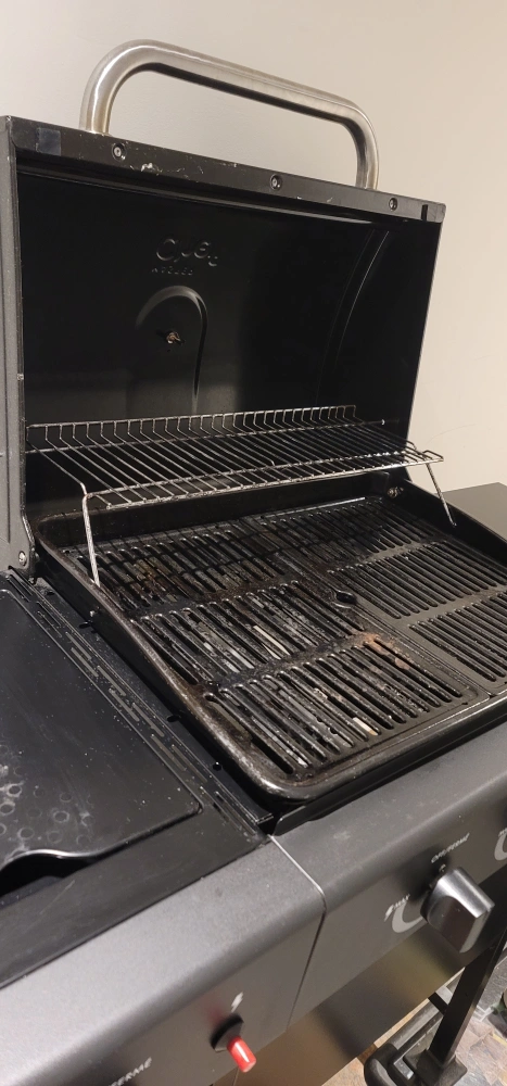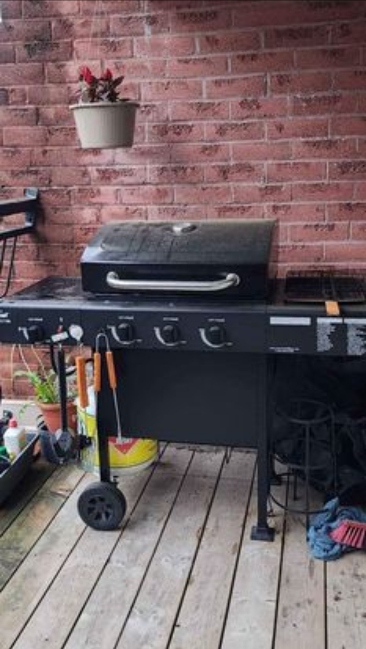 Masterchef BBQ with 1 side burner. Comes with a cover. Has a large cooking area. Includes a warming rack. The grill is on wheels and can easily be moved around. Has a built-in thermometer. Everything is perfectly fine and in working condition with no damage at all.