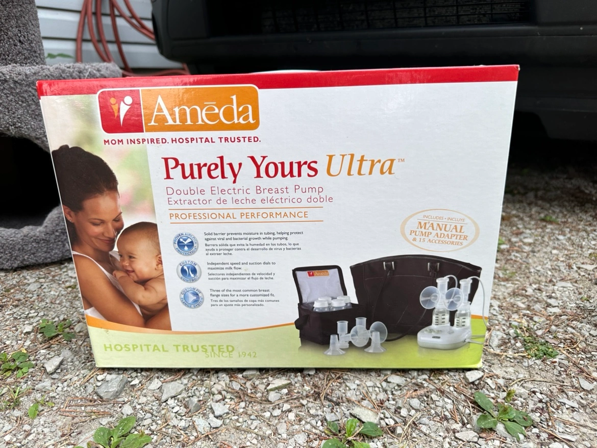This is a double electric breast pump in its original packaging, with a manual pump adapter and 15 accessories.