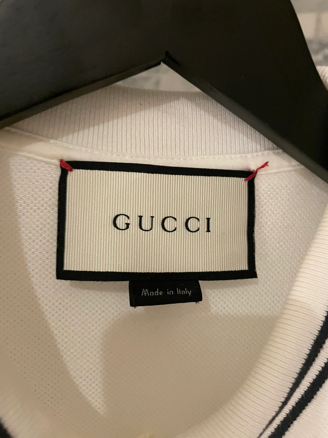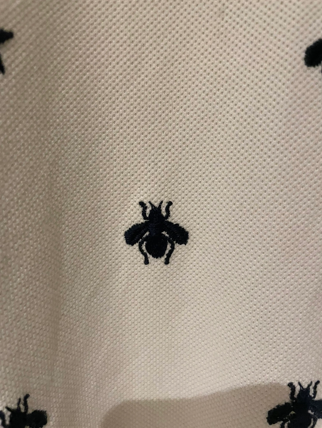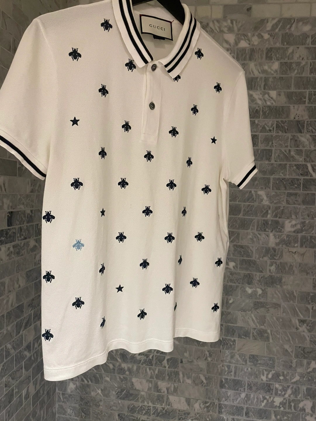 Gucci polo in size medium. Gender neutral style. Embroidered bees and five point stars in dark navy blue, almost black. Perfect condition; worn once. Great for a summer wedding or boat party.