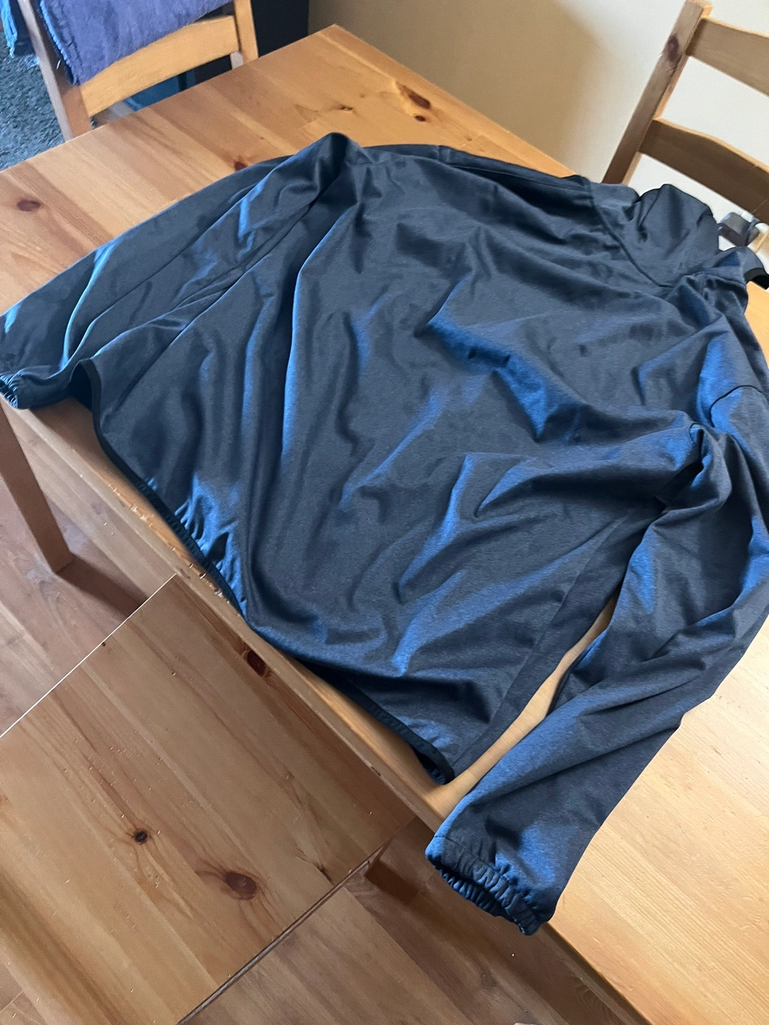 This is a New Balance windbreaker jacket with a half zipper. It has a hood. The jacket is blue, with black and grey in colour. It has the New Balance logo on the front and the words "New Balance" written on the left sleeve.