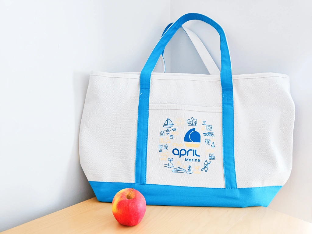 1000+White canvas tote bag with blue trim and an April Marine logo. Never used. Pick up only