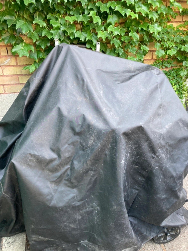 Black BBQ cover. Excellent quality and only used for 1 year. This is a very large and durable cover that cost nearly $100 new, but we‘ve downsized to a small charcoal grill. A budget price for an excellent grill cover!