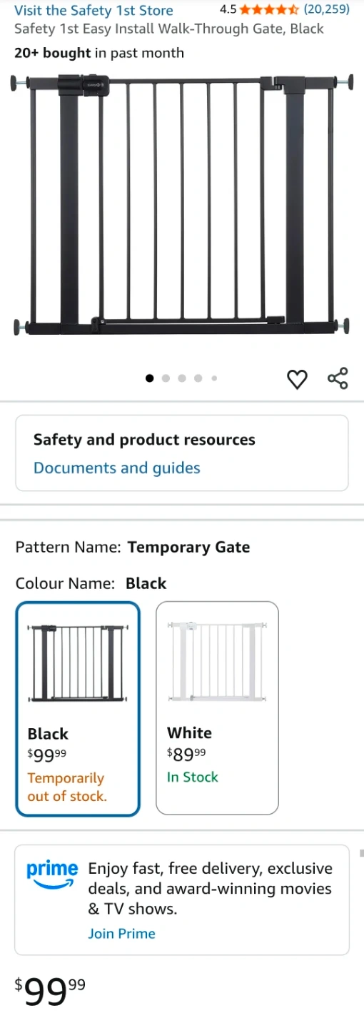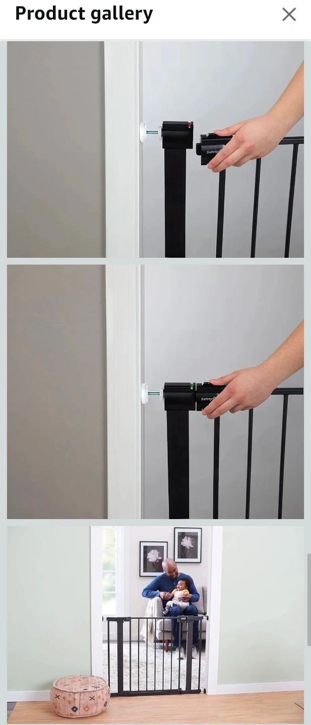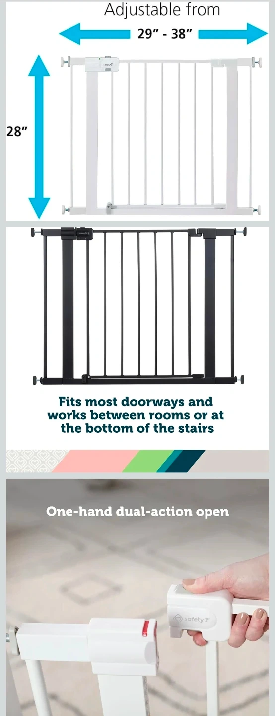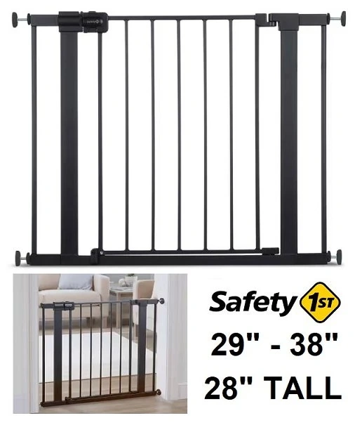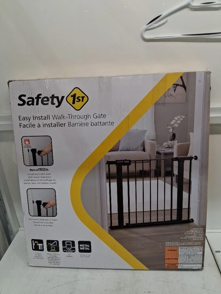 This is a new Safety 1st Easy Install Walk-Thru Gate, in black, designed for doorways, hallways, and the bottom of stairs. It extends from 29 to 38 inches wide with included extensions.