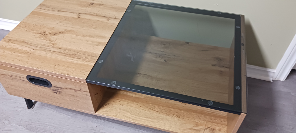 This coffee table is in good condition and has a glass top and a drawer for storage. It is perfect for any living room. CASH ONLY