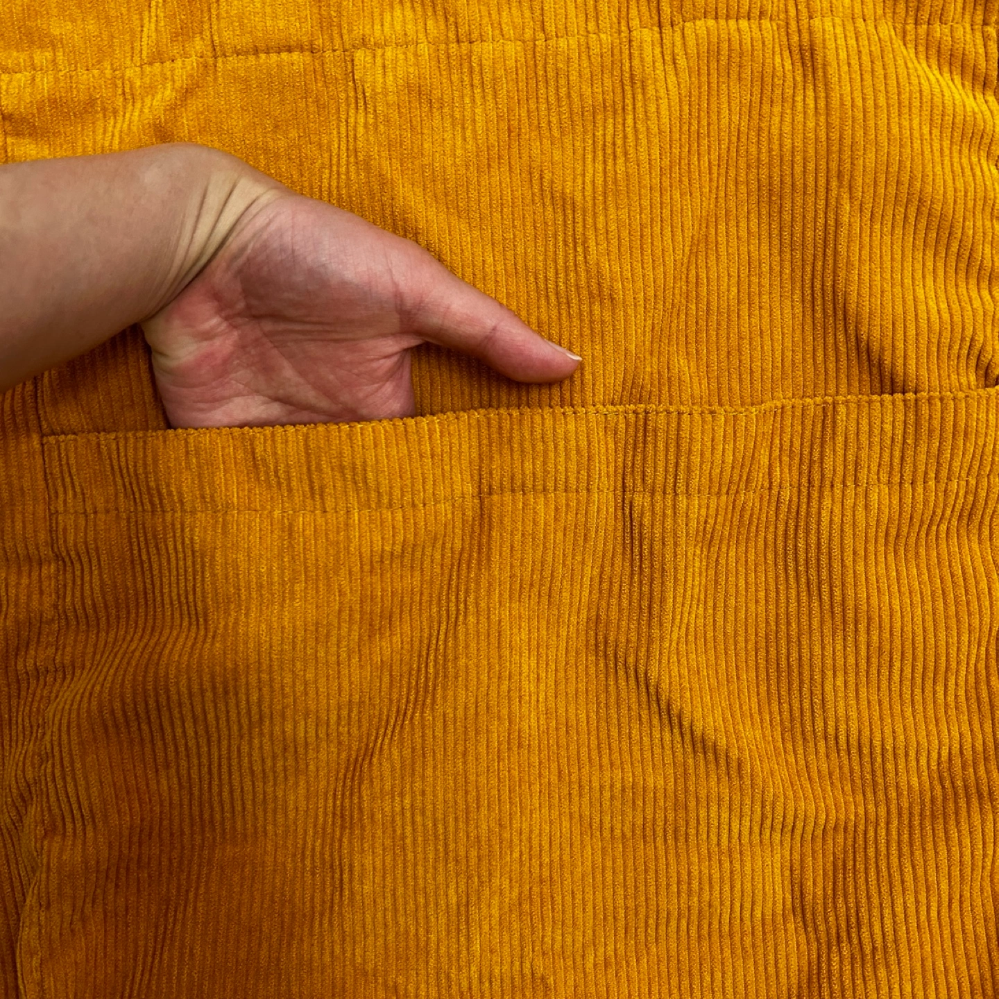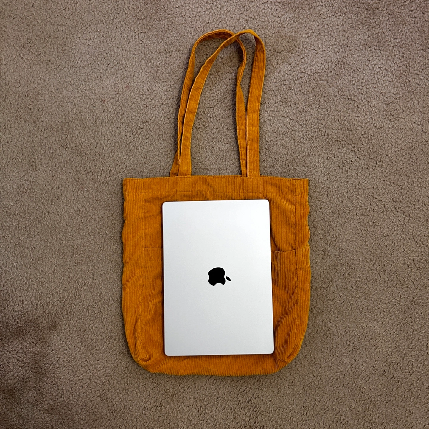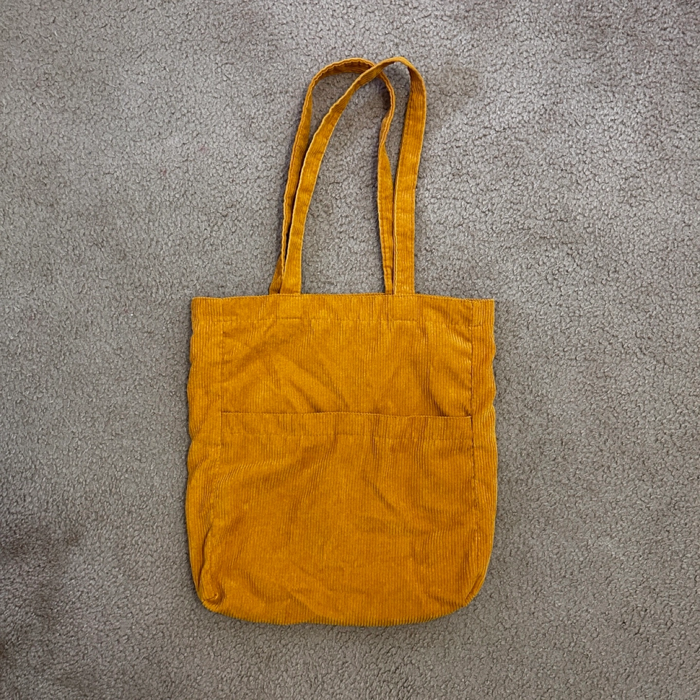 A mustard yellow corduroy tote bag with a front pocket. The bag is perfect for carrying books, a laptop, or other everyday essentials. Pick up only.