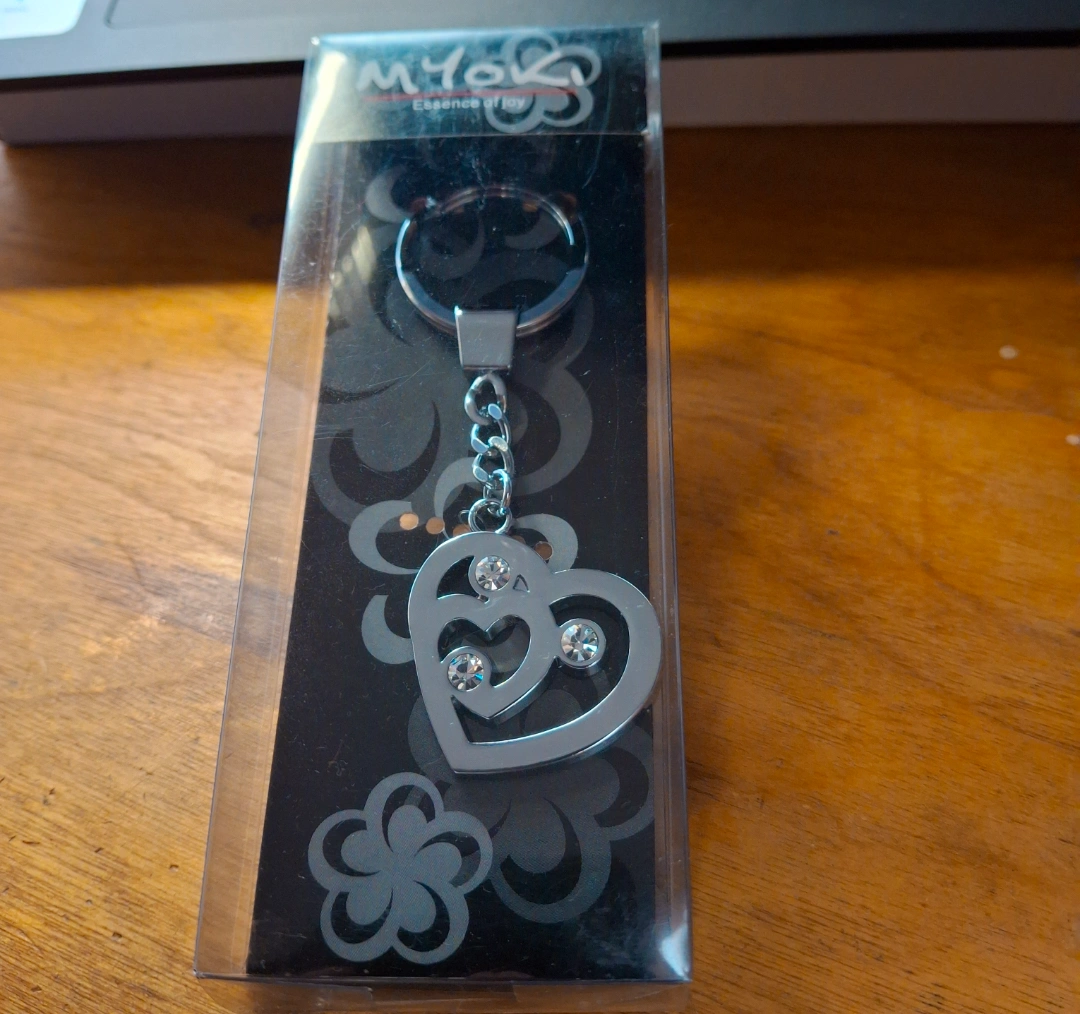 Silver keychain with heart charm and rhinestones. In original packaging.