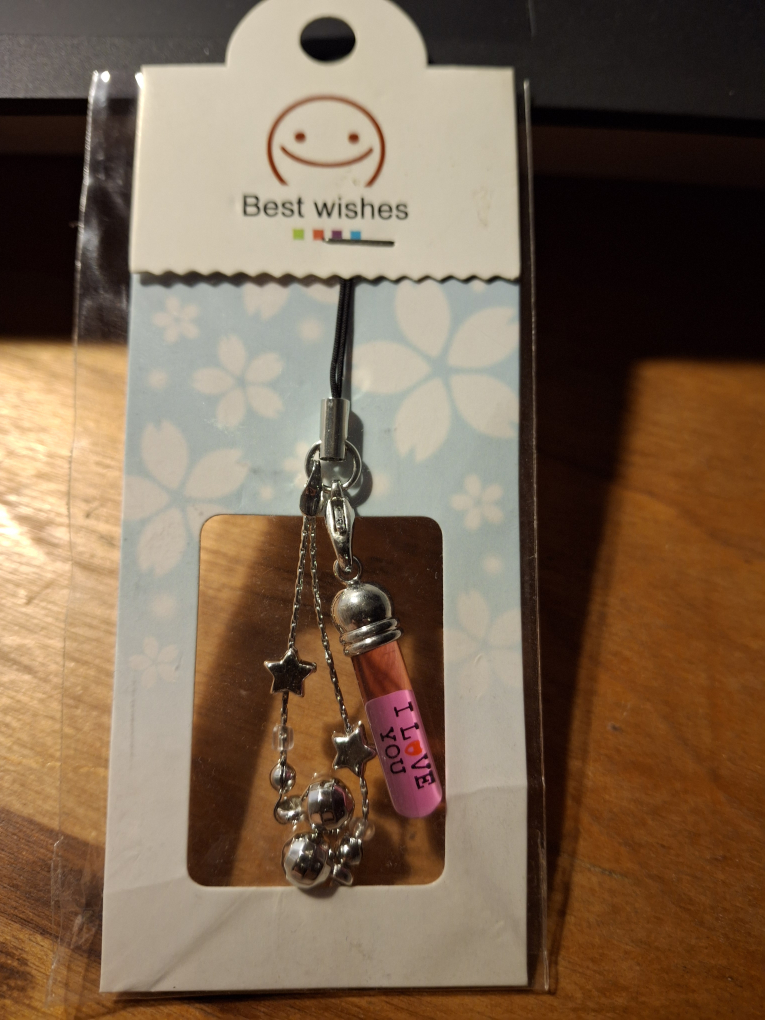 Silver charm with a pink tube that says "I Love You" on it, has stars and bells attached.