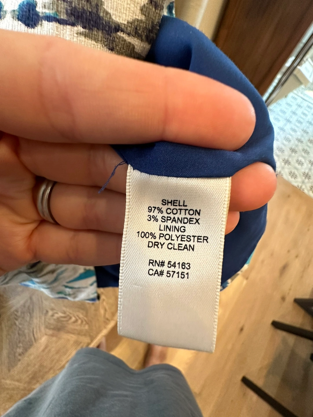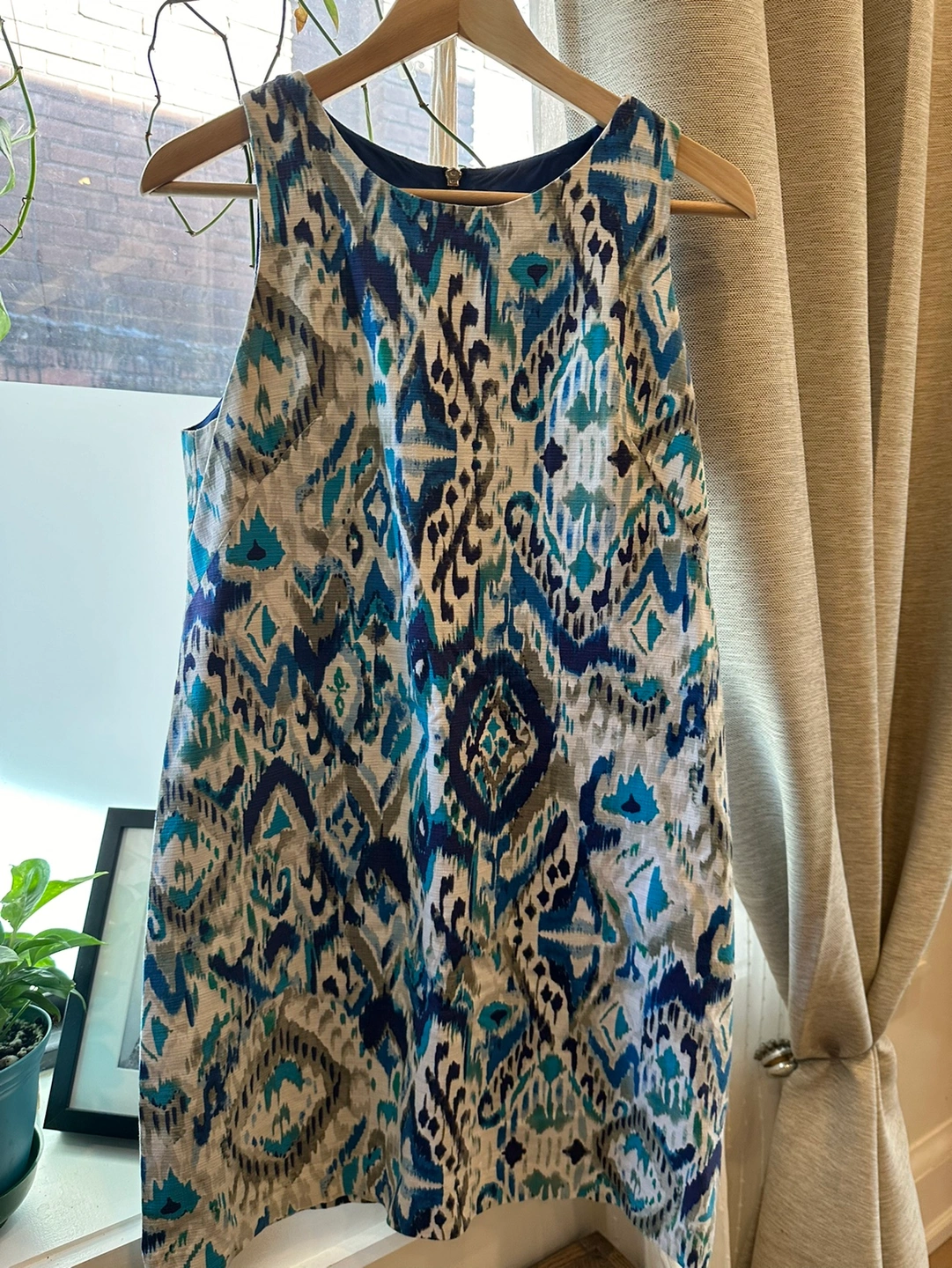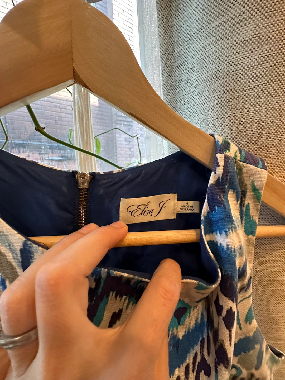 This is a beautiful blue and white patterned dress by Eliza J. It is sleeveless and has a zipper up the back. The dress is made of a light, comfortable fabric that is perfect for summer. It is a size 6.