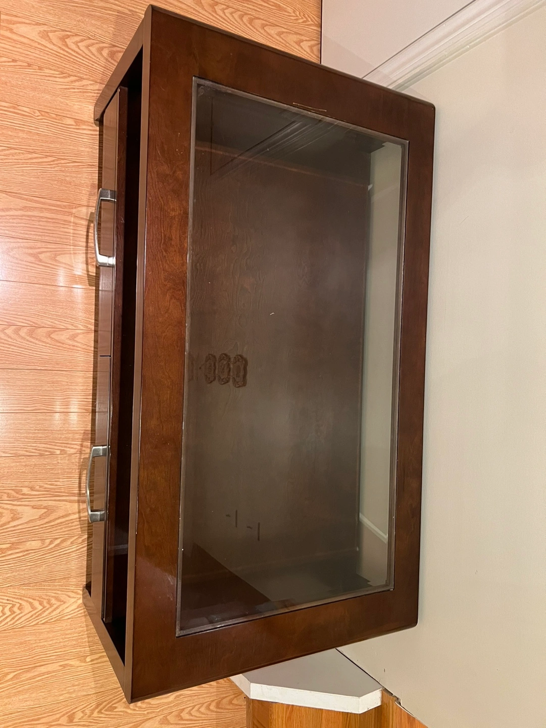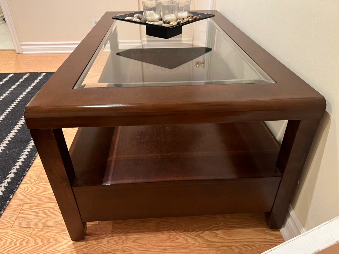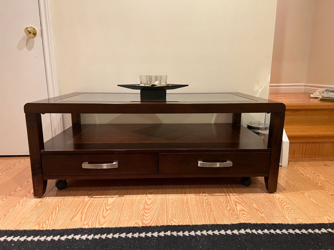 This coffee table features a glass top, a lower shelf, and two drawers for storage. It also has wheels for easy movement.