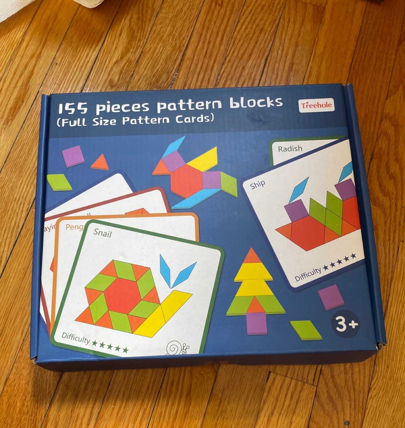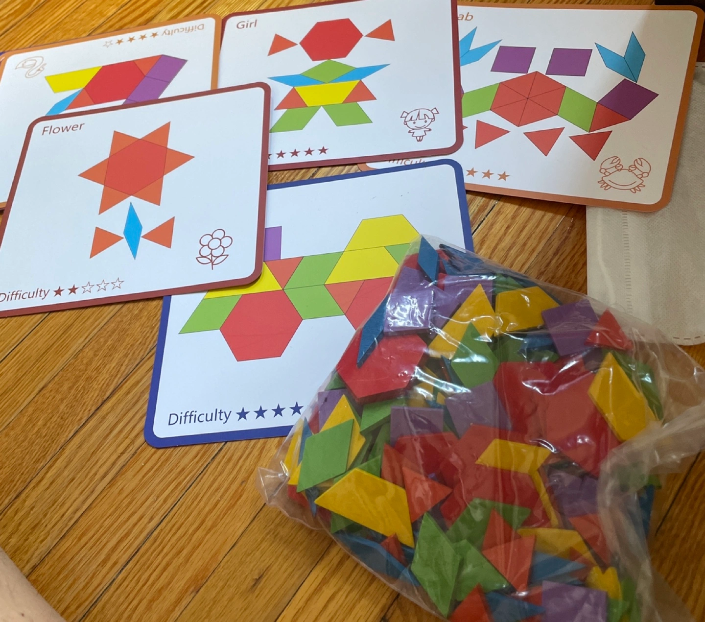 This set includes 155 pattern blocks and 10 pattern cards. The blocks are in a plastic bag and the cards are all in excellent condition. Used once or twice by my kid. She is 7 now and no more interested to play with this. Ideal for kids 3-5 years old.