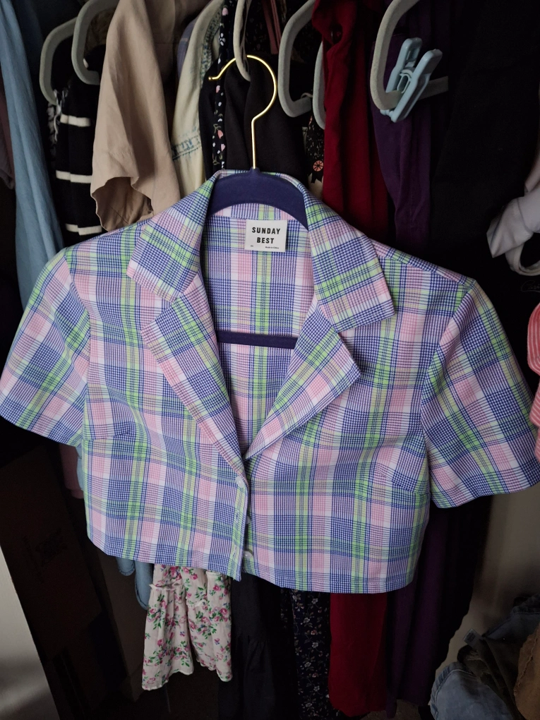 Cropped short sleeved plaid button up shirt from Aritzia, in a light blue, pink, and green plaid. From a smoke free/pet free house.