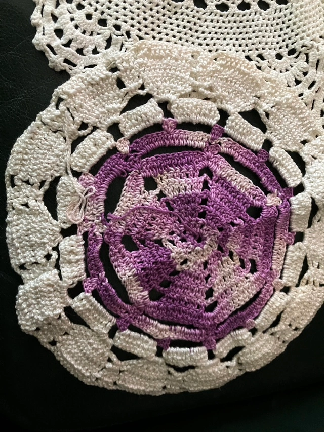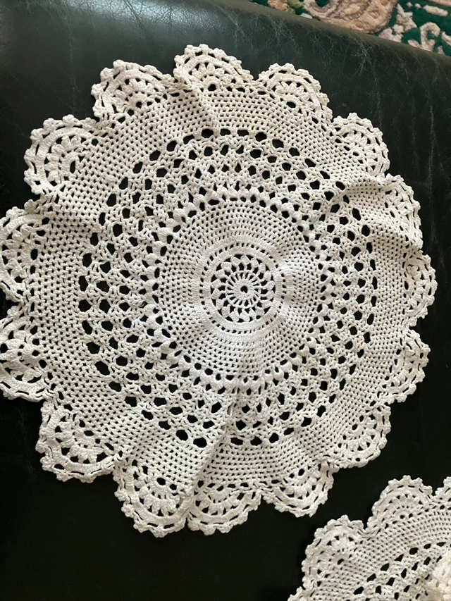Four beautiful crocheted doilies, three white and one purple. A lovely set for adding a touch of vintage charm to your home