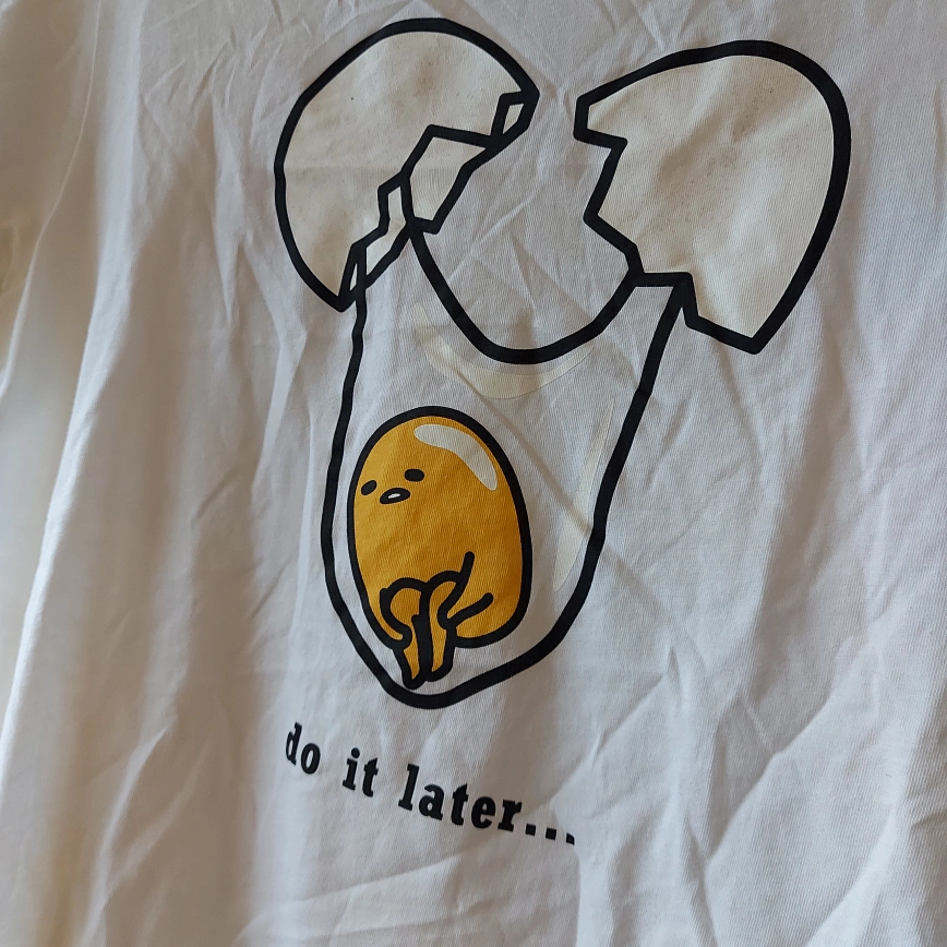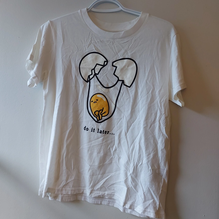 1000+I think i might have worn this once, it now no longer fits. White t-shirt with a Gudetama graphic, size medium. Exact amount in cash please. Bring your own bag.