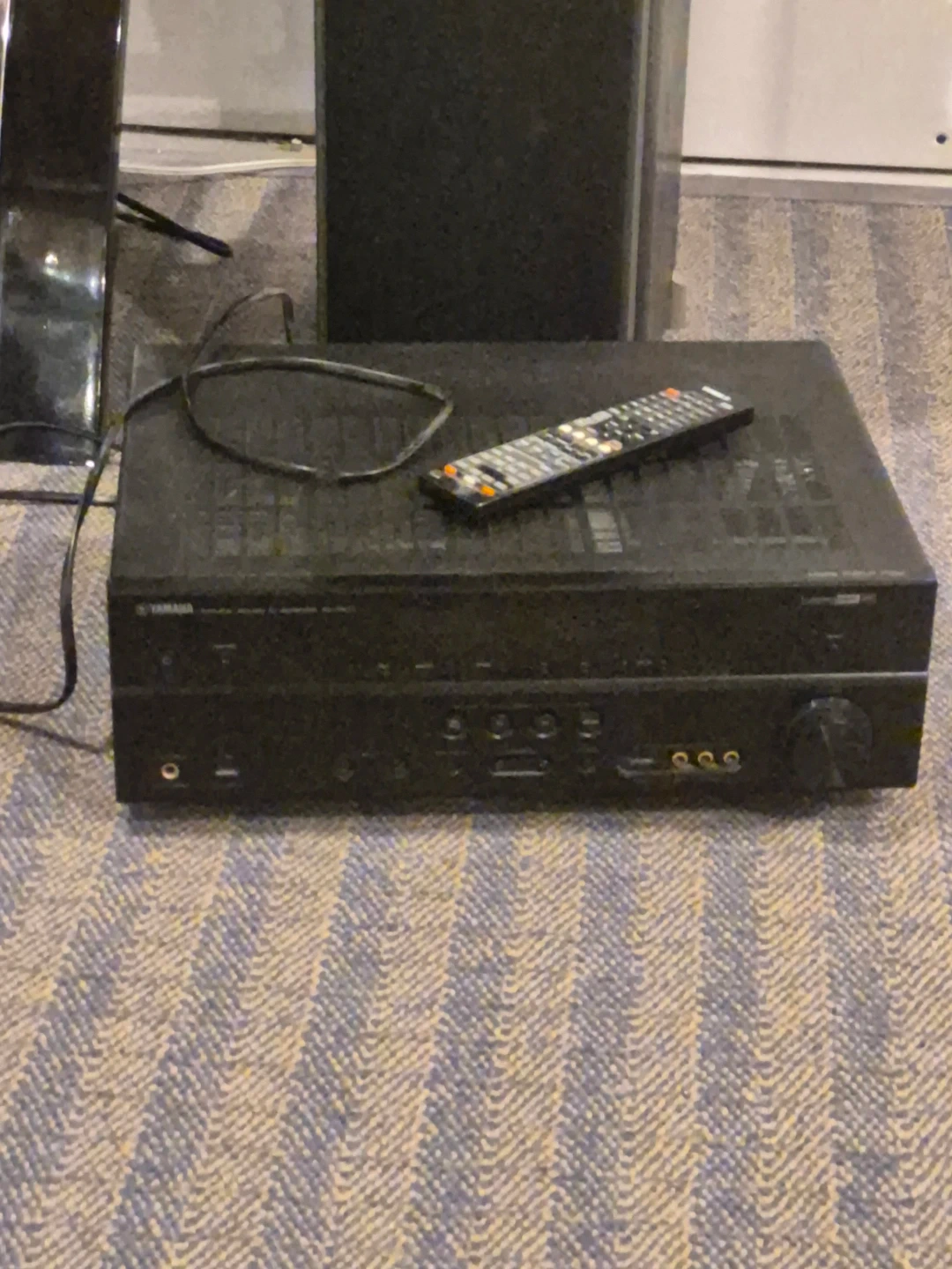 This is a Yamaha AV receiver. It comes with its original remote control. It's a black unit, perfect for home theatre setups.