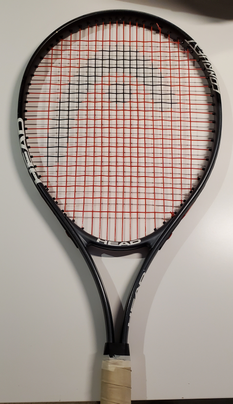 This tennis racquet is in good condition. It has been lightly used and shows minimal signs of wear.