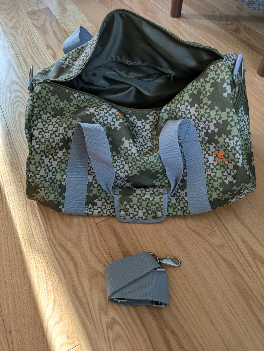 Large duffle bag with wide side pockets, inner pocket, travel tag, and a removable strap.It is a good size for carrying items for a short trip.