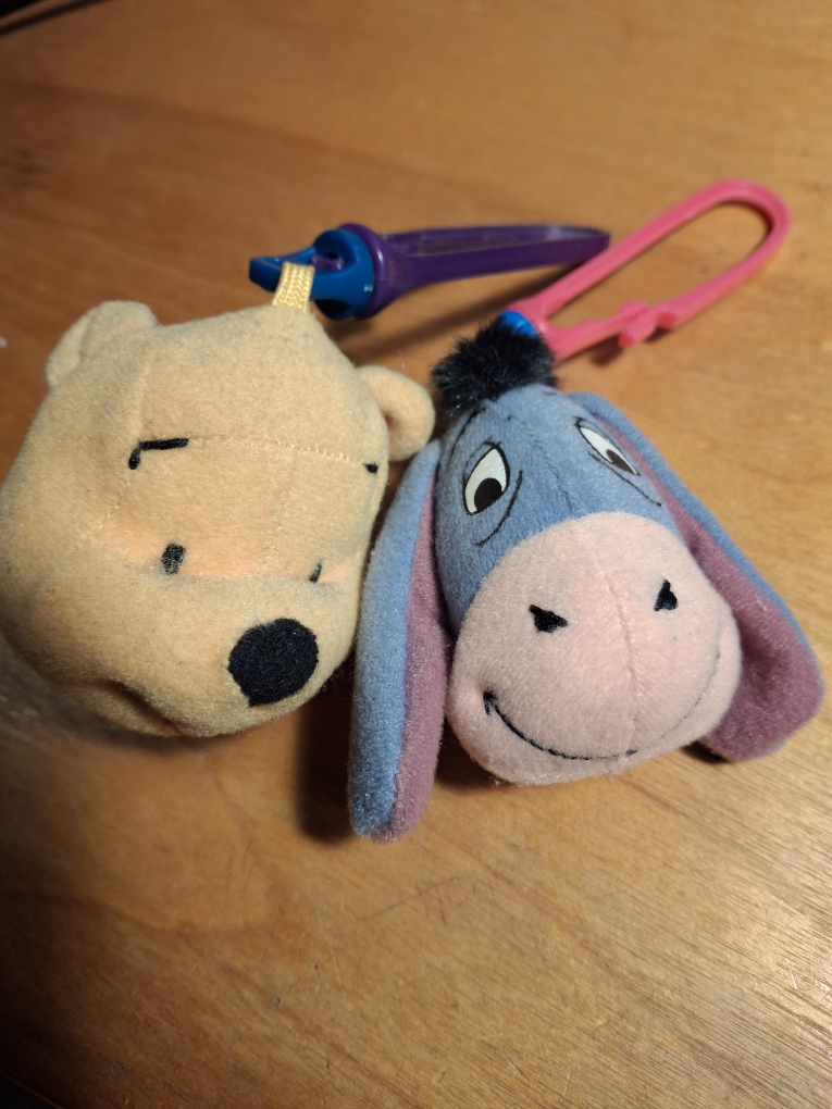 2 plush keychains of Winnie the Pooh and Eeyore. Each plush character has a plastic ring attached to its head for easy attaching to a keychain or bag.