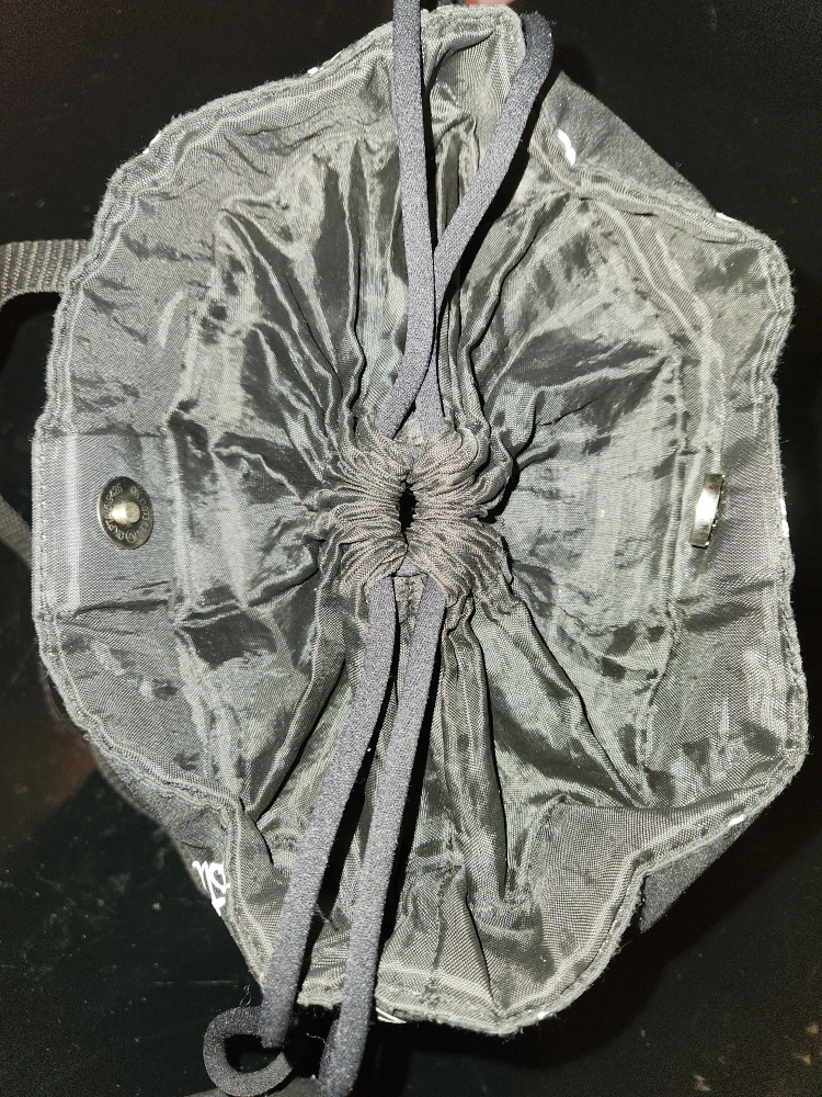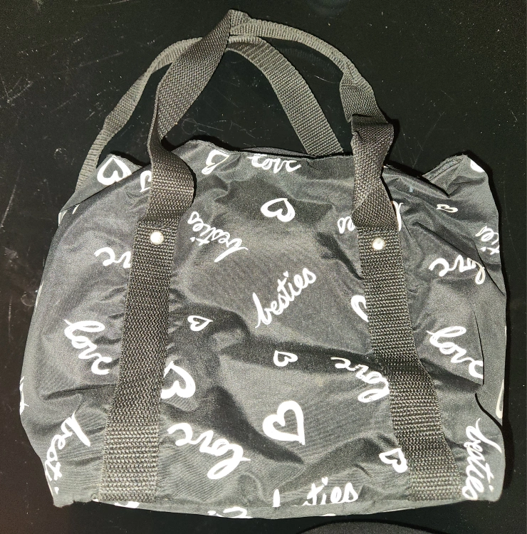 This is a black drawstring lunchbag with white lettering and hearts that reads "Besties" on the front. It has two black handles and a drawstring closure. The bag is in almost perfect condition.