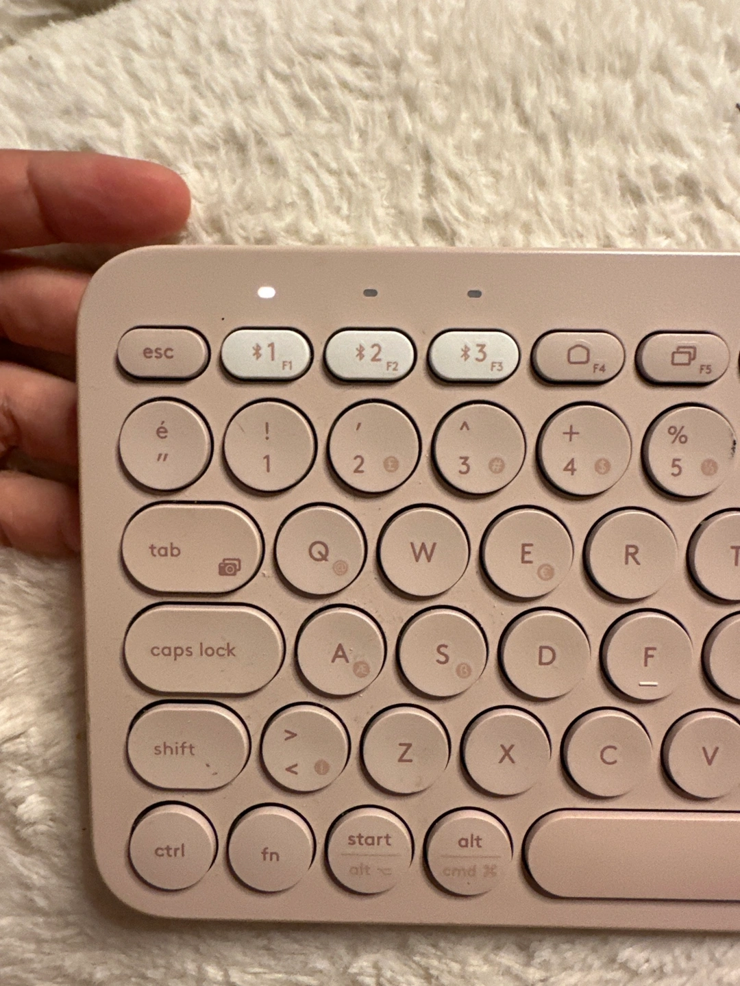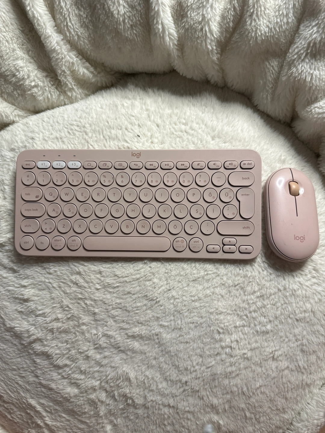 A wireless keyboard and mouse combo in a light pink colour. The keyboard has round keys and the mouse is small.