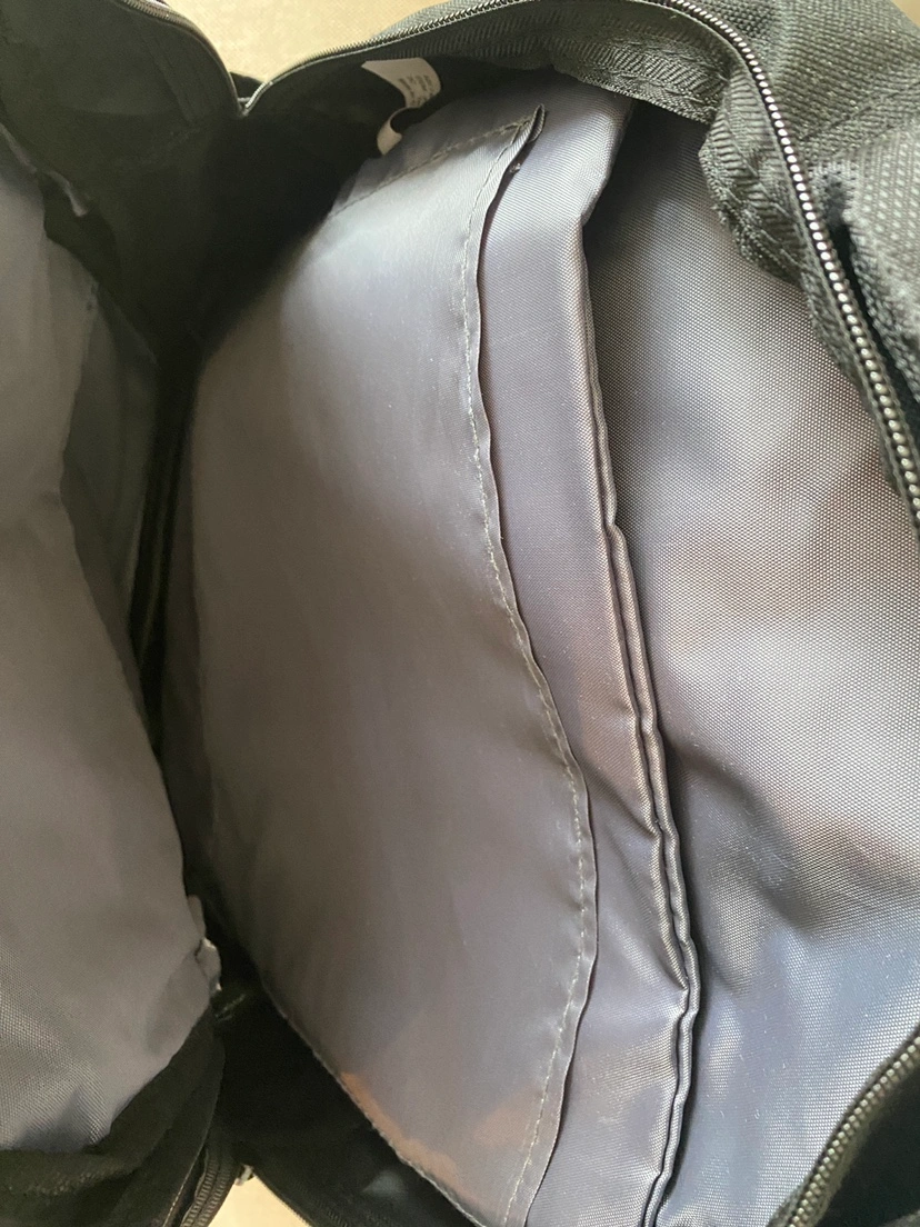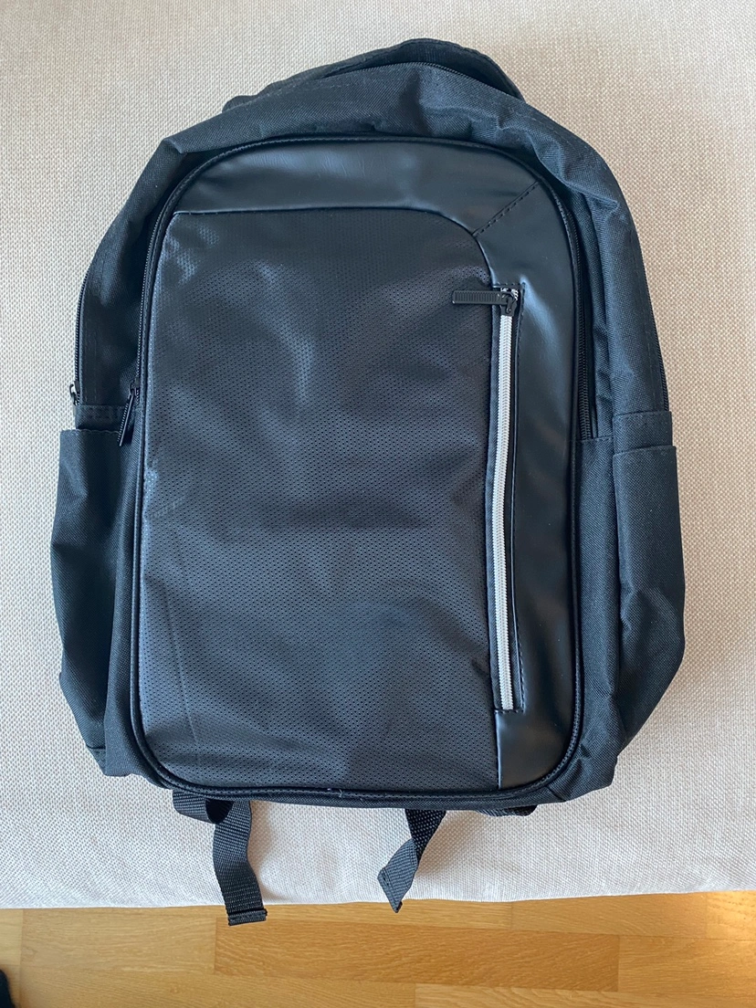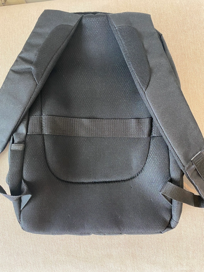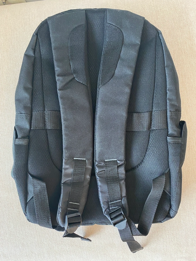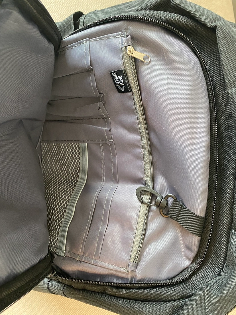 A black laptop backpack with lots of storage. It has a zippered pocket with a "RFID Shield". There is a mesh pocket and a zippered pocket in the main compartment. The backpack has a padded laptop sleeve and two side pockets for bottles.