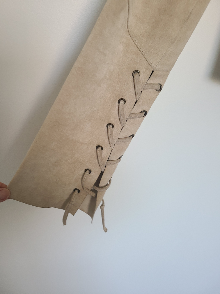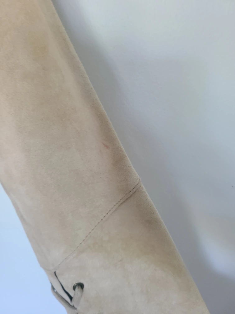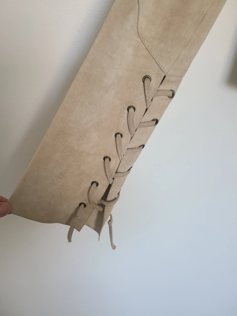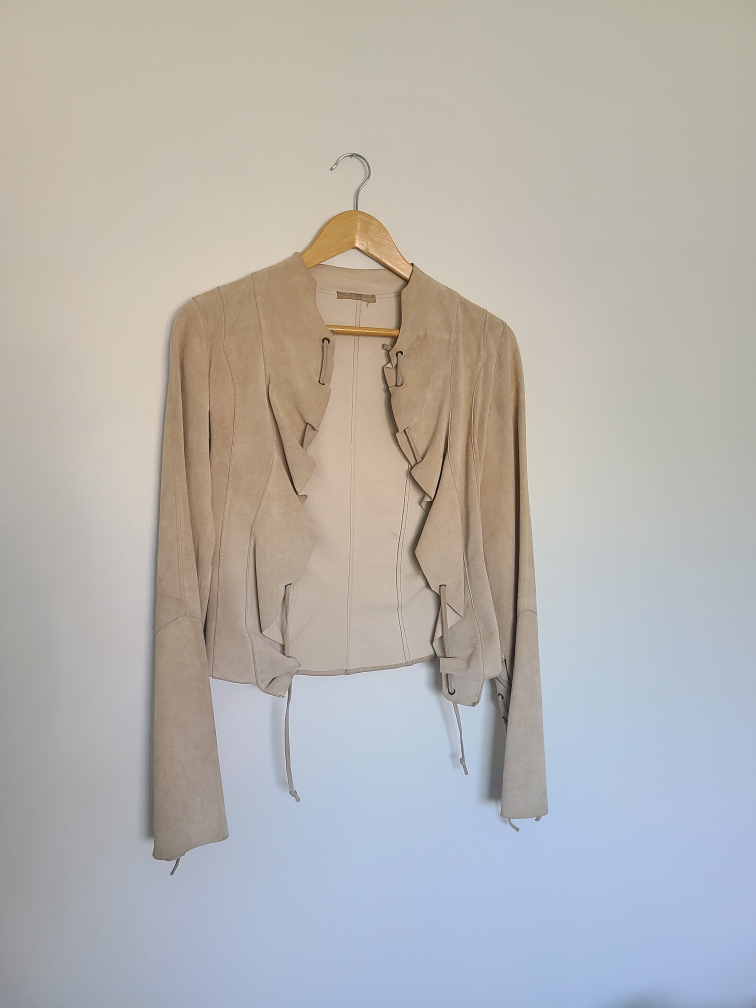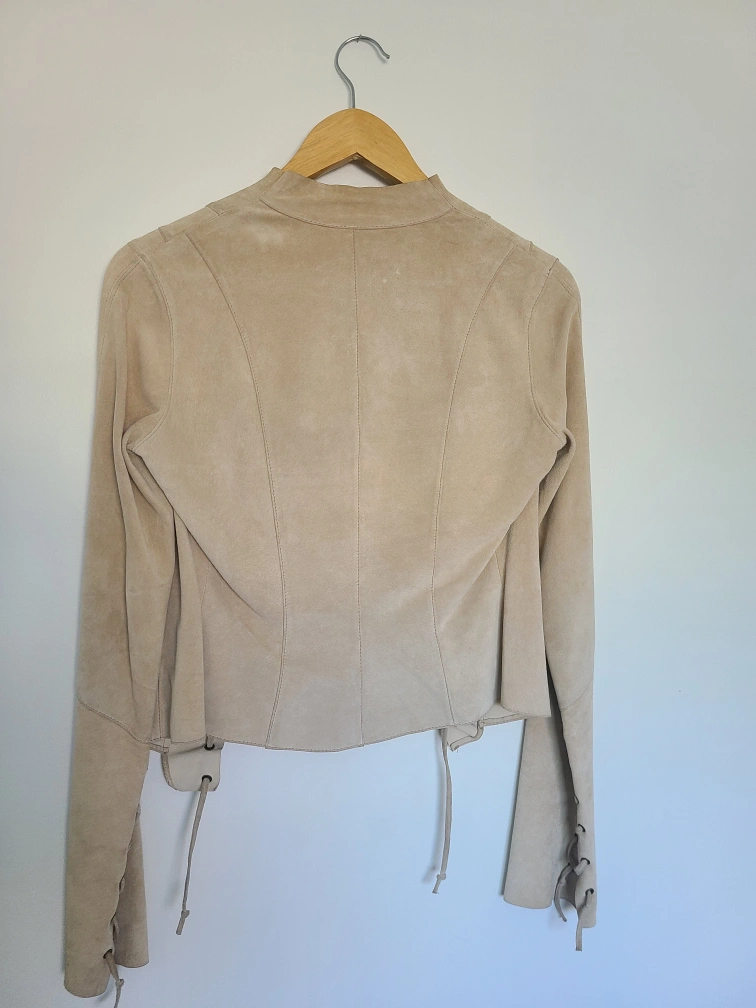 A beige suede jacket with lace up detailing on the sleeves. It is cropped and has a stand-up collar. It is a size small.